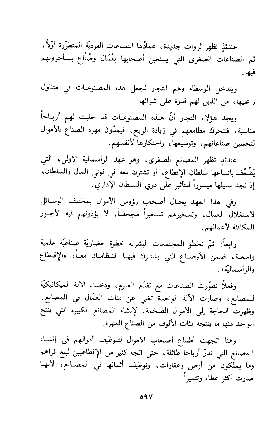 عندئذٍ تظهر ثروات جديدة، عمادُها الصناعات الفردية المتطورة أولاً، ثم الصناعات الصغرى التي يستعين أصحابها بعمال وصناع يستأجرونهم فيها.