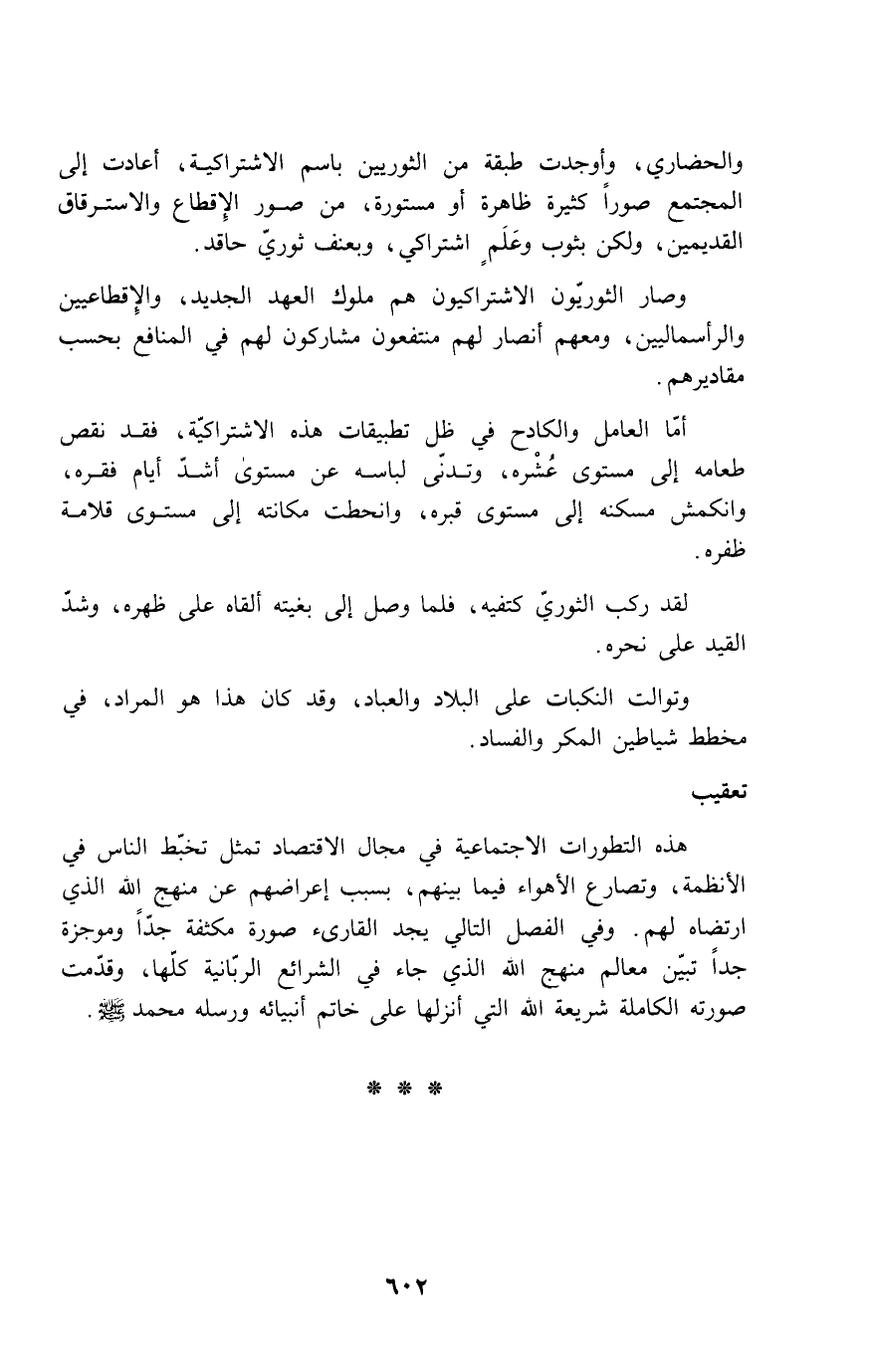 والحضاري، وأوجدت طبقة من الثوريين باسم الاشتراكية، أعادت إلى المجتمع صوراً كثيرة ظاهرة أو مستورة، من صور الإقطاع والاسترقاق القديمين، ولكن بثوبٍ وعَلَمٍ اشتراكي، وبعنف ثوري حاقد.