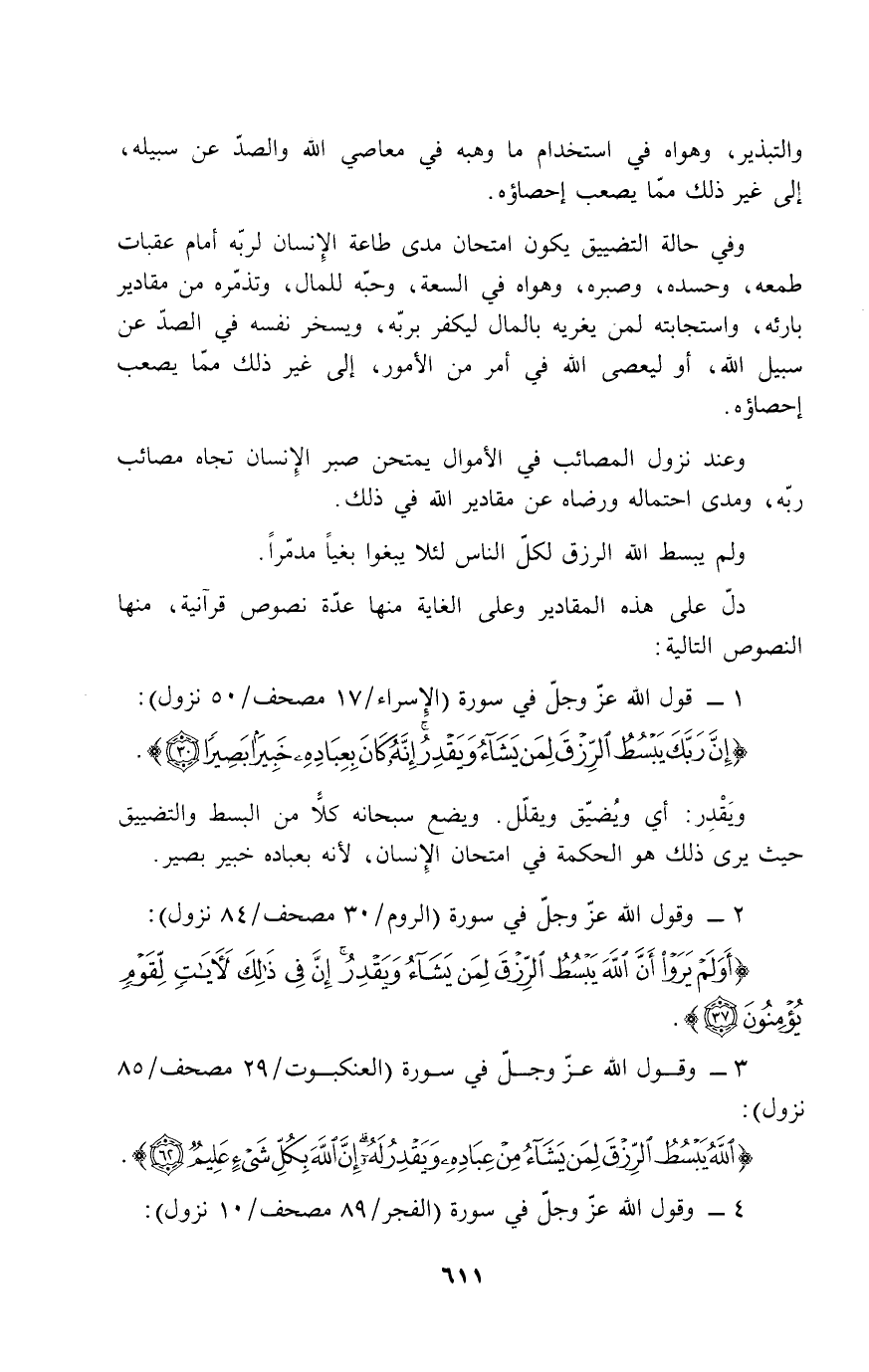 وفي حالة التضييق يكون امتحان مدى طاعة الإنسان لربه أمام عقبات طمعه وحسده وصبره وهواه في السعة وحبه للمال وتذمره من مقادير بارئه واستجابته لمن يغريه بالمال ليكفر بربه ويسخر نفسه في الصد عن سبيل الله أو ليعصي الله في أمر من الأمور إلى غير ذلك مما يصعب إحصاؤه.