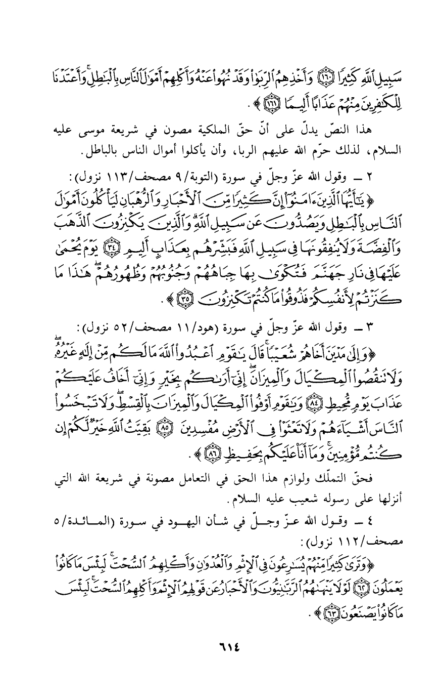 هذا النص يدل على أن حق الملكية مصون في شريعة موسى عليه السلام، لذلك حرم الله عليهم الربا، وأن يأكلوا أموال الناس بالباطل.
