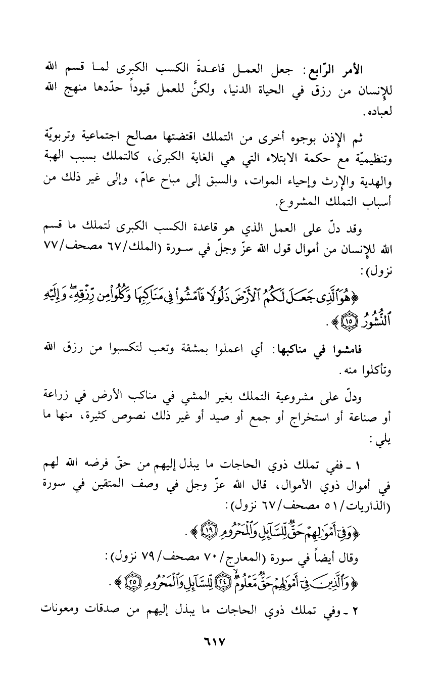 وقد دل على العمل الذي هو قاعدة الكسب الكبرى لتملك ما قسم الله للإنسان من أموال قول الله عز وجل في سورة (الملك/67 مصحف/77 نزول) :