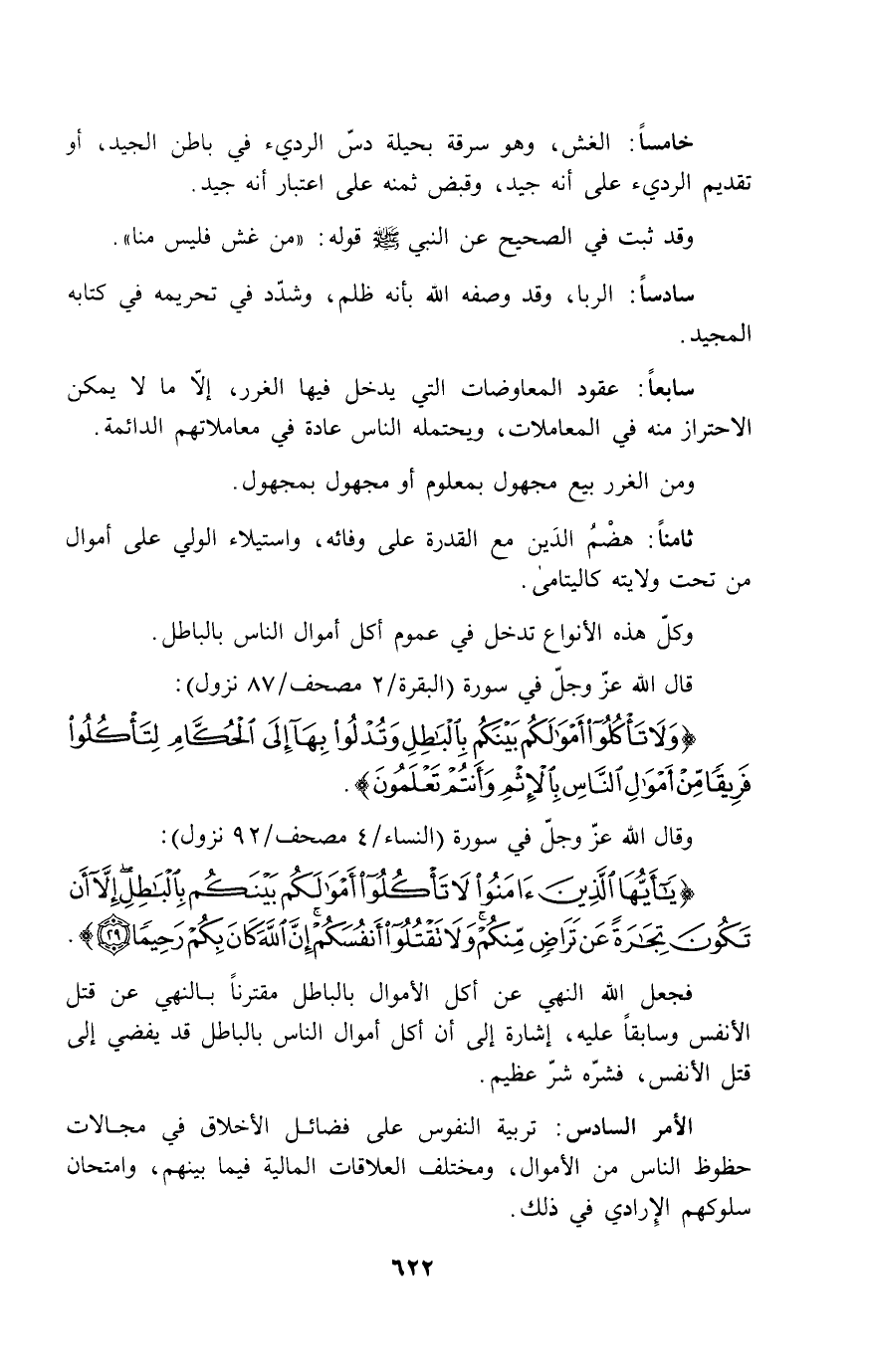 الأمر السادس: تربية النفوس على فضائل الأخلاق في مجالات حظوظ الناس من الأموال، ومختلف العلاقات المالية فيما بينهم، وامتحان سلوكهم الإداري في ذلك.