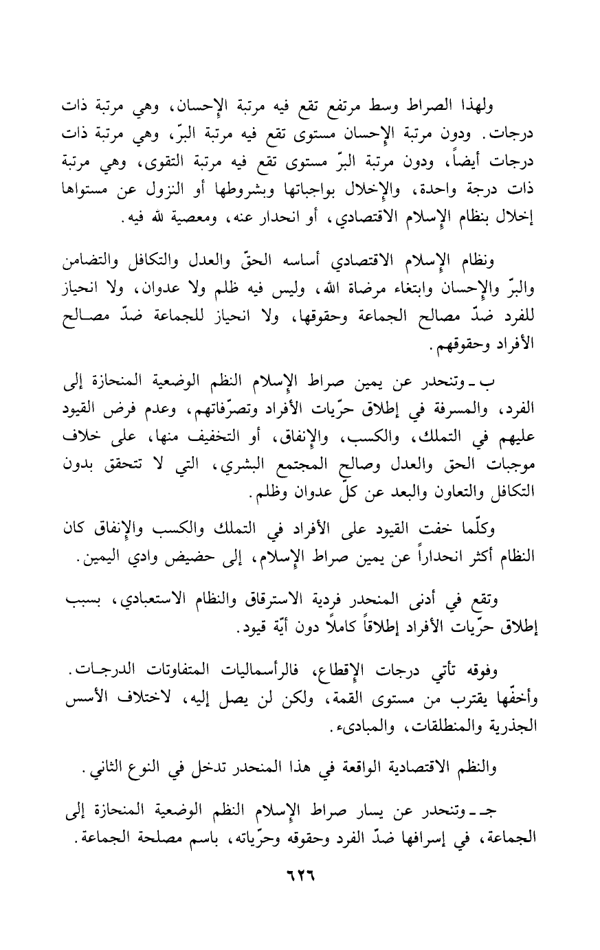 ولهذا الصراط وسط مرتفع تقع فيه مرتبة الإحسان، وهي مرتبة ذات درجات. ودون مرتبة الإحسان مستوى تقع فيه مرتبة البر، وهي مرتبة ذات درجات أيضاً، ودون مرتبة البر مستوى تقع فيه مرتبة التقوى، وهي مرتبة ذات درجة واحدة، والإخلال بواجباتها وبشروطها أو النزول عن مستواها إخلال بنظام الإسلام الاقتصادي، أو انحدار عنه، ومعصية لله فيه.