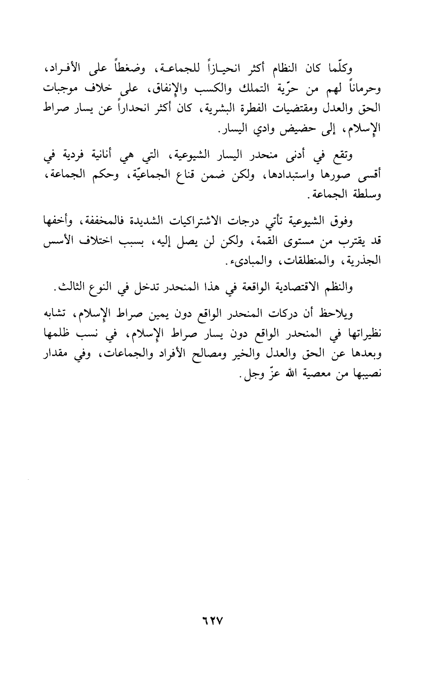 وكلما كان النظام أكثر انحيازاً للجماعة، وضغطاً على الأفراد، وحرماناً لهم من حرية التملك والكسب والإنفاق، وضغطاً على الأفراد، وحرماناً لهم من حرية التملك والكسب والإنفاق على خلاف موجبات الحق والعدل ومقتضيات الفطرة البشرية، كان أكثر انحداراً عن يسار صراط الإسلام، إلى حضيض وادي اليسار.