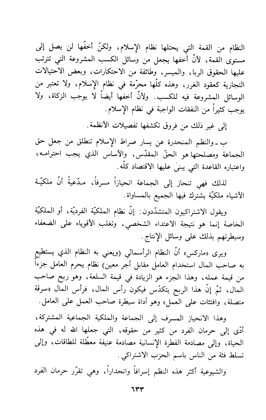 ب- والنظم المنحدرة عن يسار صراط الإسلام تنطلق من جعل حق الجماعة ومصلحتها هو الحق المقدس، والأساس الذي يجب احترامه، واعتباره القاعدة التي يبنى عليها الاقتصاد كله.