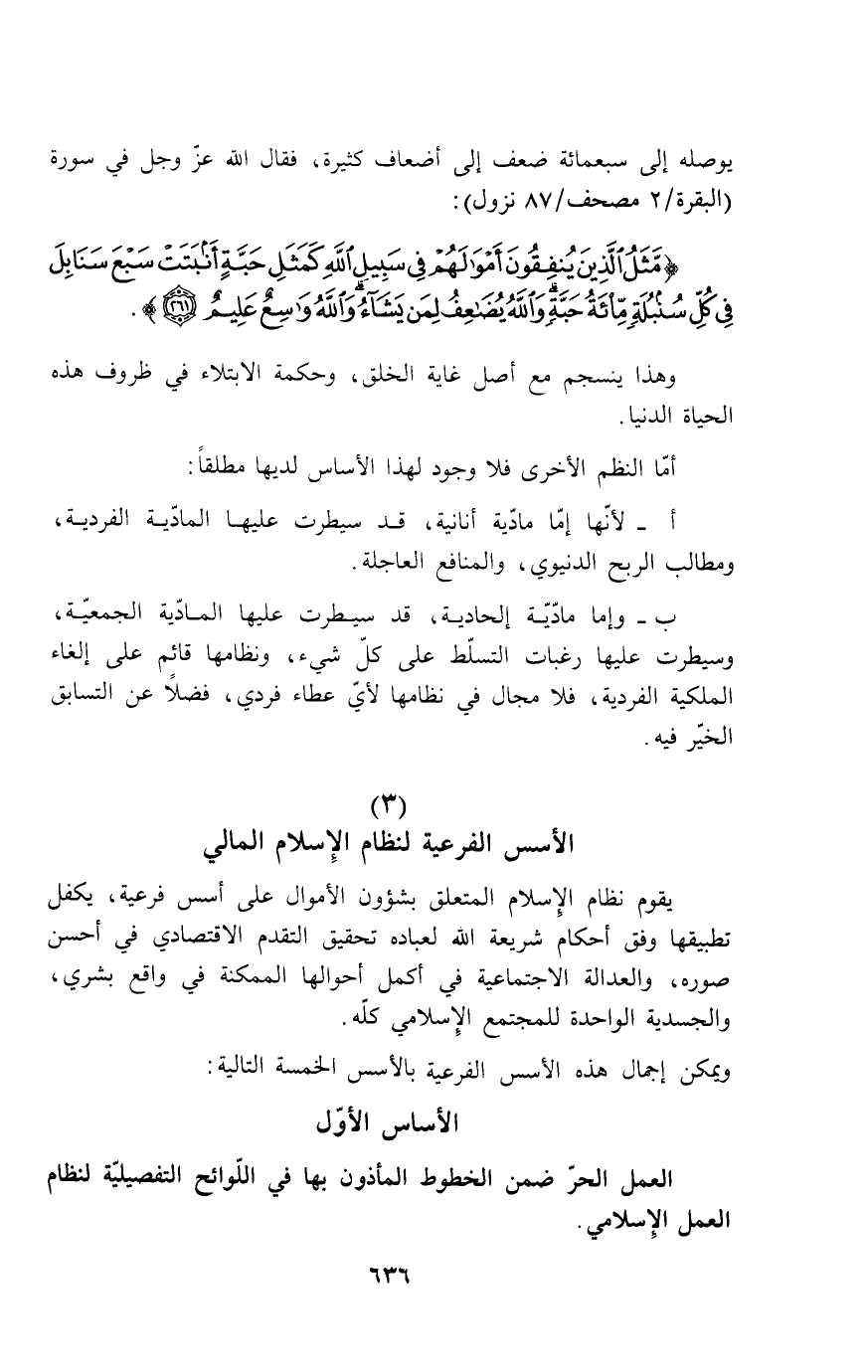 يقول نظام الإسلام المتعلق بشؤون المال على أسس فرعية، يكفل تطبيقها وفق أحكام شريعة الله لعباده تحقيق التقدم الاقتصادي في أحسن صوره، والعدالة الاجتماعية في أكمل أحوالها الممكنة في واقع بشري، والجسدية الواحدة للمجتمع الإسلامي كله.
