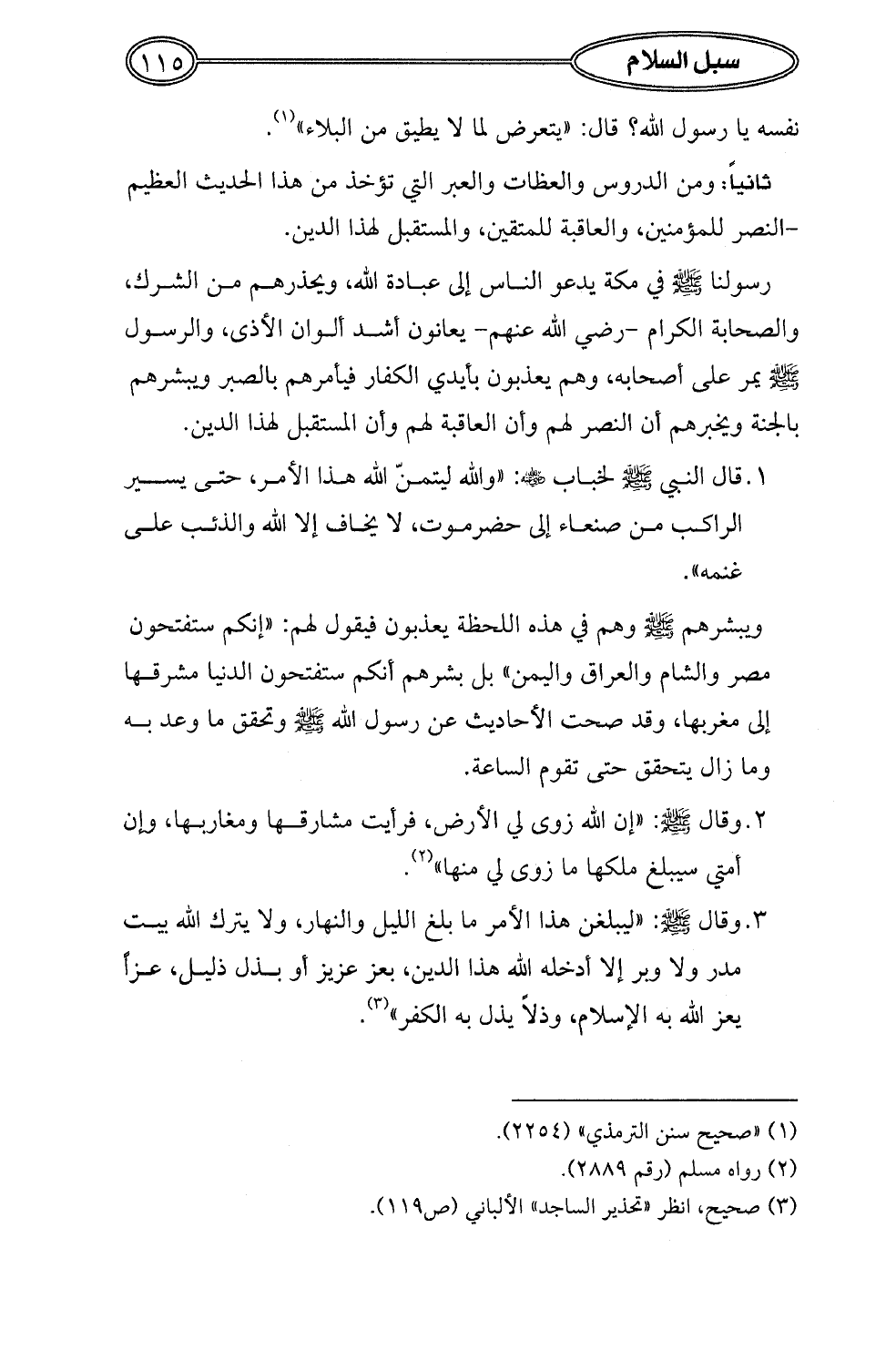 ويبشرهم - صلى الله عليه وسلم - وهم في هذه اللحظة يعذبون فيقول لهم: "إنكم ستفتحون مصر والشام والعراق واليمن" بل بشرهم أنكم ستفتحون الدنيا من مشرقها إلى مغربها، وقد صحت الأحاديث عن رسول الله - صلى الله عليه وسلم - وتحقق ما وعد به وما زال يتحقق حتى تقوم الساعة.