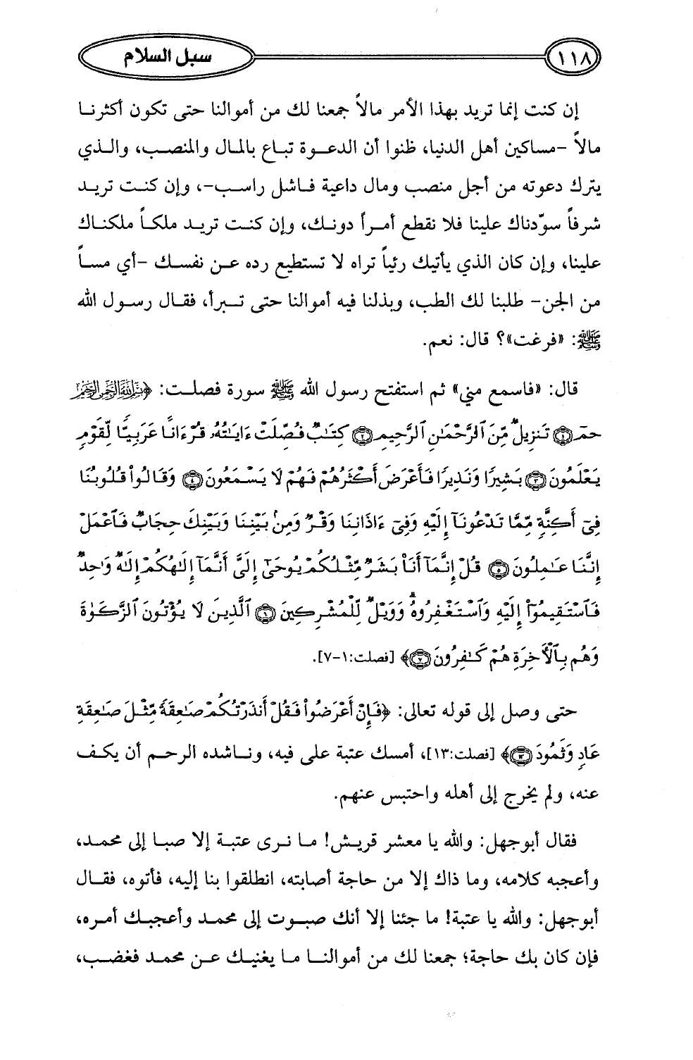 قال: "فاسمع مني" ثم استفتح رسول الله - صلى الله عليه وسلم - سورة فصلت: {بِسْمِ اللَّهِ الرَّحْمَنِ الرَّحِيمِ حم (1) تَنْزِيلٌ مِنَ الرَّحْمَنِ الرَّحِيمِ (2) كِتَابٌ فُصِّلَتْ آيَاتُهُ قُرْآنًا عَرَبِيًّا لِقَوْمٍ يَعْلَمُونَ (3) بَشِيرًا وَنَذِيرًا فَأَعْرَضَ أَكْثَرُهُمْ فَهُمْ لَا يَسْمَعُونَ (4) وَقَالُوا قُلُوبُنَا فِي أَكِنَّةٍ مِمَّا تَدْعُونَا إِلَيْهِ وَفِي آذَانِنَا وَقْرٌ وَمِنْ بَيْنِنَا وَبَيْنِكَ حِجَابٌ فَاعْمَلْ إِنَّنَا عَامِلُونَ (5) قُلْ إِنَّمَا أَنَا بَشَرٌ مِثْلُكُمْ يُوحَى إِلَيَّ أَنَّمَا إِلَهُكُمْ إِلَهٌ وَاحِدٌ فَاسْتَقِيمُوا إِلَيْهِ وَاسْتَغْفِرُوهُ وَوَيْلٌ لِلْمُشْرِكِينَ (6) الَّذِينَ لَا يُؤْتُونَ الزَّكَاةَ وَهُمْ بِالْآخِرَةِ هُمْ كَافِرُونَ (7)} [فصلت: 1 - 7].