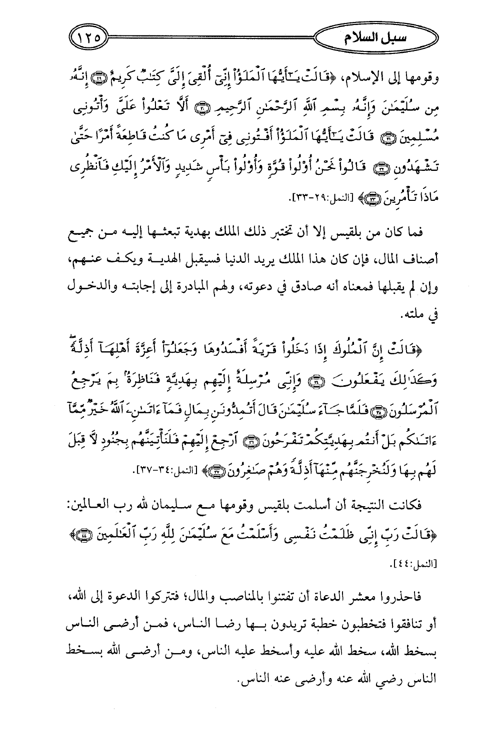 وقومها إلى الإسلام، {قَالَتْ يَا أَيُّهَا الْمَلَأُ إِنِّي أُلْقِيَ إِلَيَّ كِتَابٌ كَرِيمٌ (29) إِنَّهُ مِنْ سُلَيْمَانَ وَإِنَّهُ بِسْمِ اللَّهِ الرَّحْمَنِ الرَّحِيمِ (30) أَلَّا تَعْلُوا عَلَيَّ وَأْتُونِي مُسْلِمِينَ (31) قَالَتْ يَا أَيُّهَا الْمَلَأُ أَفْتُونِي فِي أَمْرِي مَا كُنْتُ قَاطِعَةً أَمْرًا حَتَّى تَشْهَدُونِ (32) قَالُوا نَحْنُ أُولُو قُوَّةٍ وَأُولُو بَأْسٍ شَدِيدٍ وَالْأَمْرُ إِلَيْكِ فَانْظُرِي مَاذَا تَأْمُرِينَ (33)} [النمل: 29 - 33].