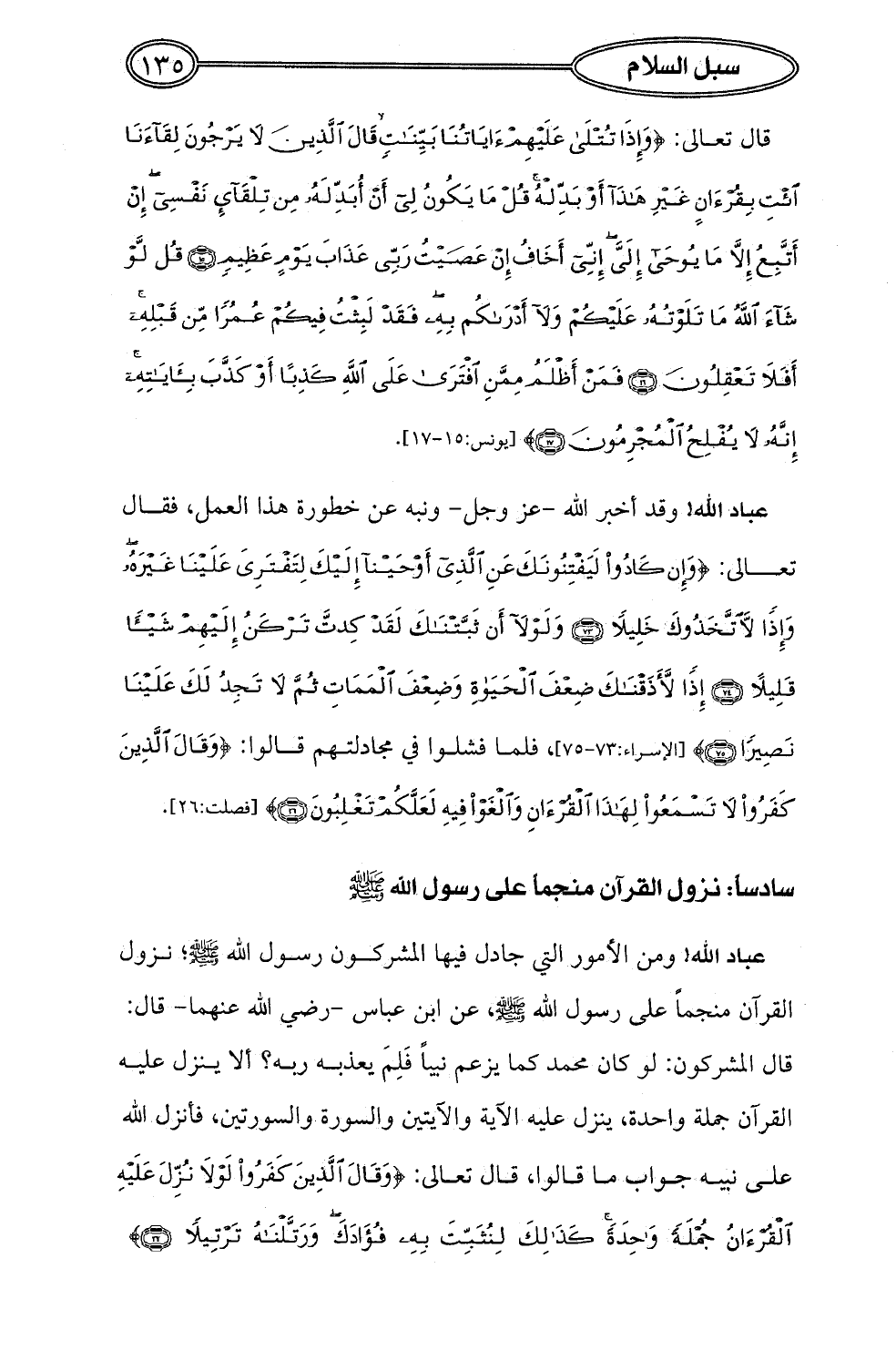 عباد الله! ومن الأمور التي جادل فيها المشركون رسول الله - صلى الله عليه وسلم -؛ نزول القرآن منجماً على رسول الله - صلى الله عليه وسلم -، عن ابن عباس -رضي الله عنهما- قال: قال المشركون: لو كان محمَّد كما يزعم نبياً فَلِمَ يعذبه ربه؟ ألا ينزل عليه القرآن جملة واحدة، ينزل عليه الآية والآيتين والسورة والسورتين، فأنزل الله على نبيه جواب ما قالوا، قال تعالى: {وَقَالَ الَّذِينَ كَفَرُوا لَوْلَا نُزِّلَ عَلَيْهِ الْقُرْآنُ جُمْلَةً وَاحِدَةً كَذَلِكَ لِنُثَبِّتَ بِهِ فُؤَادَكَ وَرَتَّلْنَاهُ تَرْتِيلًا (32)}
