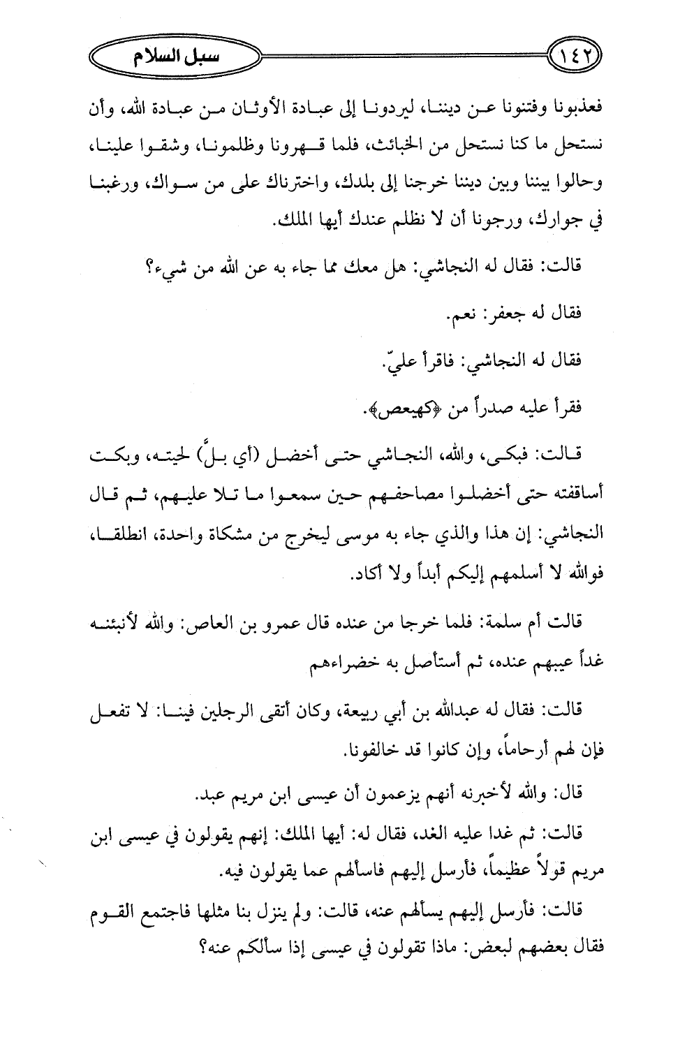 قالت: فبكى، والله، النجاشي حتى أخضل (أي بلَّ) لحيته، وبكت أساقفته حتى أخضلوا مصاحفهم حين سمعوا ما تلا عليهم، ثم قال النجاشي: إن هذا والذي جاء به موسى ليخرج من مشكاة واحدة، انطلقا، فوالله لا أسلمهم إليكم أبداً ولا أكاد.