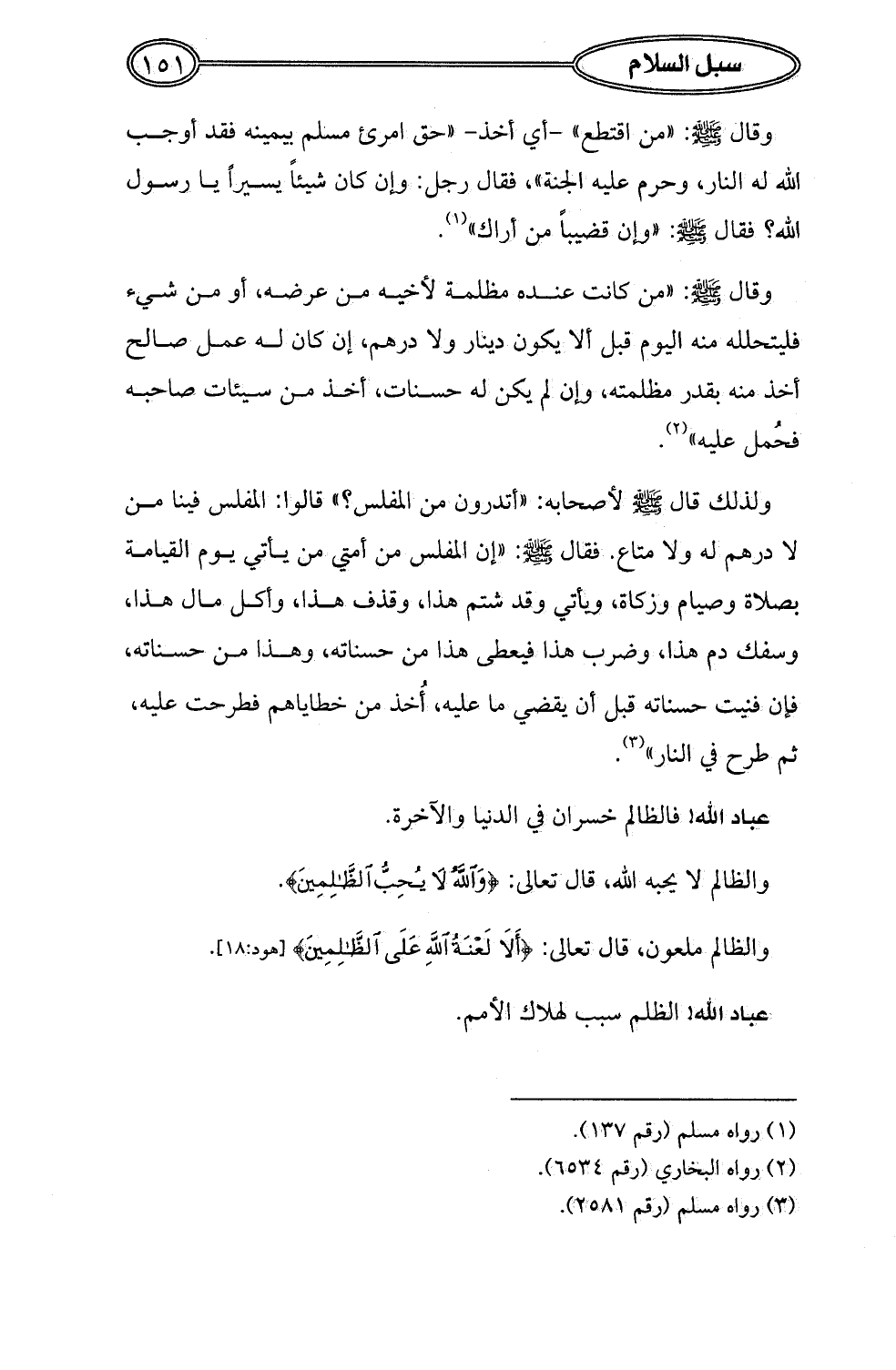 وقال - صلى الله عليه وسلم -: "من كانت عنده مظلمة لأخيه من عرضه، أو من شيء فليتحلله منه اليوم قبل ألا يكون دينار ولا درهم، إن كان له عمل صالح أخذ منه بقدر مظلمته، وإن لم يكن له حسنات، أخذ من سيئات صاحبه فحُمل عليه" (¬2).