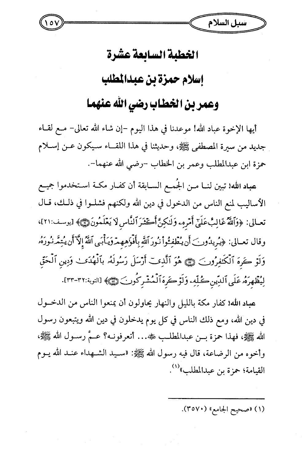 أيها الإخوة عباد الله! موعدنا في هذا اليوم -إن شاء الله تعالى- مع لقاء جديد من سيرة المصطفى - صلى الله عليه وسلم -، وحديثنا في هذا اللقاء سيكون عن إسلام حمزة ابن عبد المطلب وعمر بن الخطاب -رضي الله عنهما -.