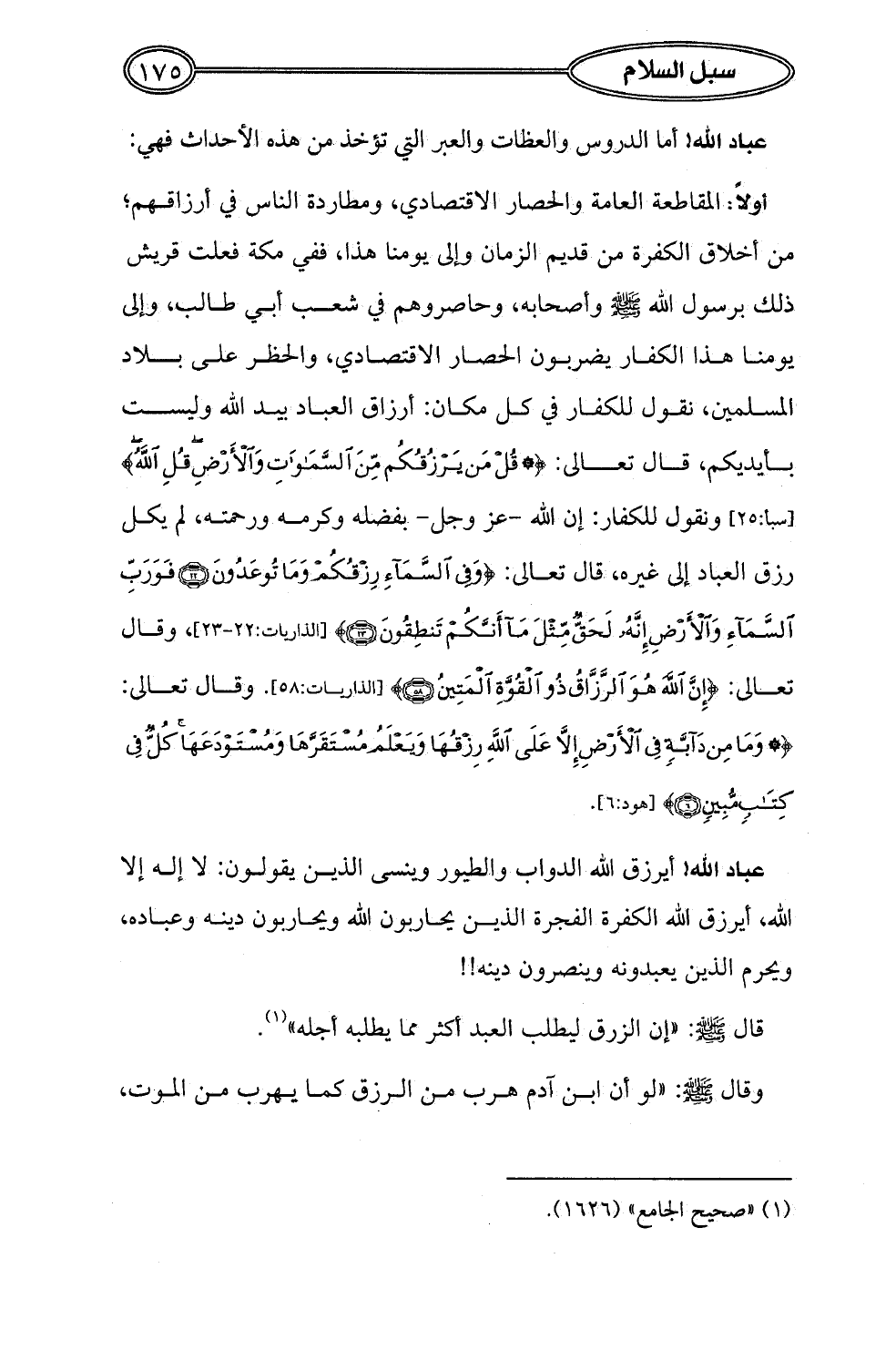 أولاً: المقاطعة العامة والحصار الاقتصادي، ومطاردة الناس في أرزاقهم؛ من أخلاق الكفرة من قديم الزمان وإلى يومنا هذا، ففي مكة فعلت قريش ذلك برسول الله - صلى الله عليه وسلم - وأصحابه، وحاصروهم في شعب أبي طالب، وإلى يومنا هذا الكفار يضربون الحصار الاقتصادي، والحظر على بلاد المسلمين، نقول للكفار في كل مكان: أرزاق العباد بيد الله وليست بايديكم، قال تعالى: {قُلْ مَنْ يَرْزُقُكُمْ مِنَ السَّمَاوَاتِ وَالْأَرْضِ قُلِ اللَّهُ} [سبأ: 24] ونقول للكفار: إن الله -عز وجل- بفضله وكرمه ورحمته، لم يكل رزق العباد إلى غيره، قال تعالى: {وَفِي السَّمَاءِ رِزْقُكُمْ وَمَا تُوعَدُونَ (22) فَوَرَبِّ السَّمَاءِ وَالْأَرْضِ إِنَّهُ لَحَقٌّ مِثْلَ مَا أَنَّكُمْ تَنْطِقُونَ (23)} [الذاريات: 22 - 23]، وقال تعالى: {إِنَّ اللَّهَ هُوَ الرَّزَّاقُ ذُو الْقُوَّةِ الْمَتِينُ (58)} [الذاريات: 58]. وقال تعالى: {وَمَا مِنْ دَابَّةٍ فِي الْأَرْضِ إِلَّا عَلَى اللَّهِ رِزْقُهَا وَيَعْلَمُ مُسْتَقَرَّهَا وَمُسْتَوْدَعَهَا كُلٌّ فِي كِتَابٍ مُبِينٍ (6)} [هود: 6].