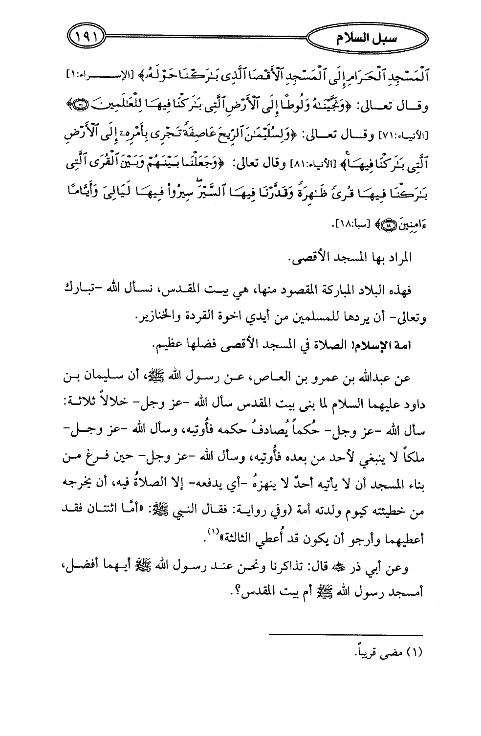 الْمَسْجِدِ الْحَرَامِ إِلَى الْمَسْجِدِ الْأَقْصَى الَّذِي بَارَكْنَا حَوْلَهُ} [الإسراء: 1] وقال تعالى: {وَنَجَّيْنَاهُ وَلُوطًا إِلَى الْأَرْضِ الَّتِي بَارَكْنَا فِيهَا لِلْعَالَمِينَ (71)} [الأنبياء: 71] وقال تعالى: {وَلِسُلَيْمَانَ الرِّيحَ عَاصِفَةً تَجْرِي بِأَمْرِهِ إِلَى الْأَرْضِ الَّتِي بَارَكْنَا فِيهَا} [الأنبياء: 81] وقال تعالى: {وَجَعَلْنَا بَيْنَهُمْ وَبَيْنَ الْقُرَى الَّتِي بَارَكْنَا فِيهَا قُرًى ظَاهِرَةً وَقَدَّرْنَا فِيهَا السَّيْرَ سِيرُوا فِيهَا لَيَالِيَ وَأَيَّامًا آمِنِينَ (18)} [سبأ: 18].
