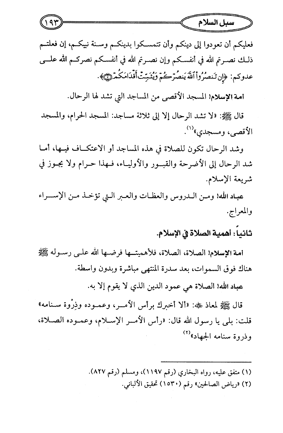 أمة الإِسلام! الصلاة، الصلاة، فلأهميتها فرضها الله على رسوله - صلى الله عليه وسلم - هناك فوق السموات، بعد سدرة المنتهى مباشرة وبدون واسطة.