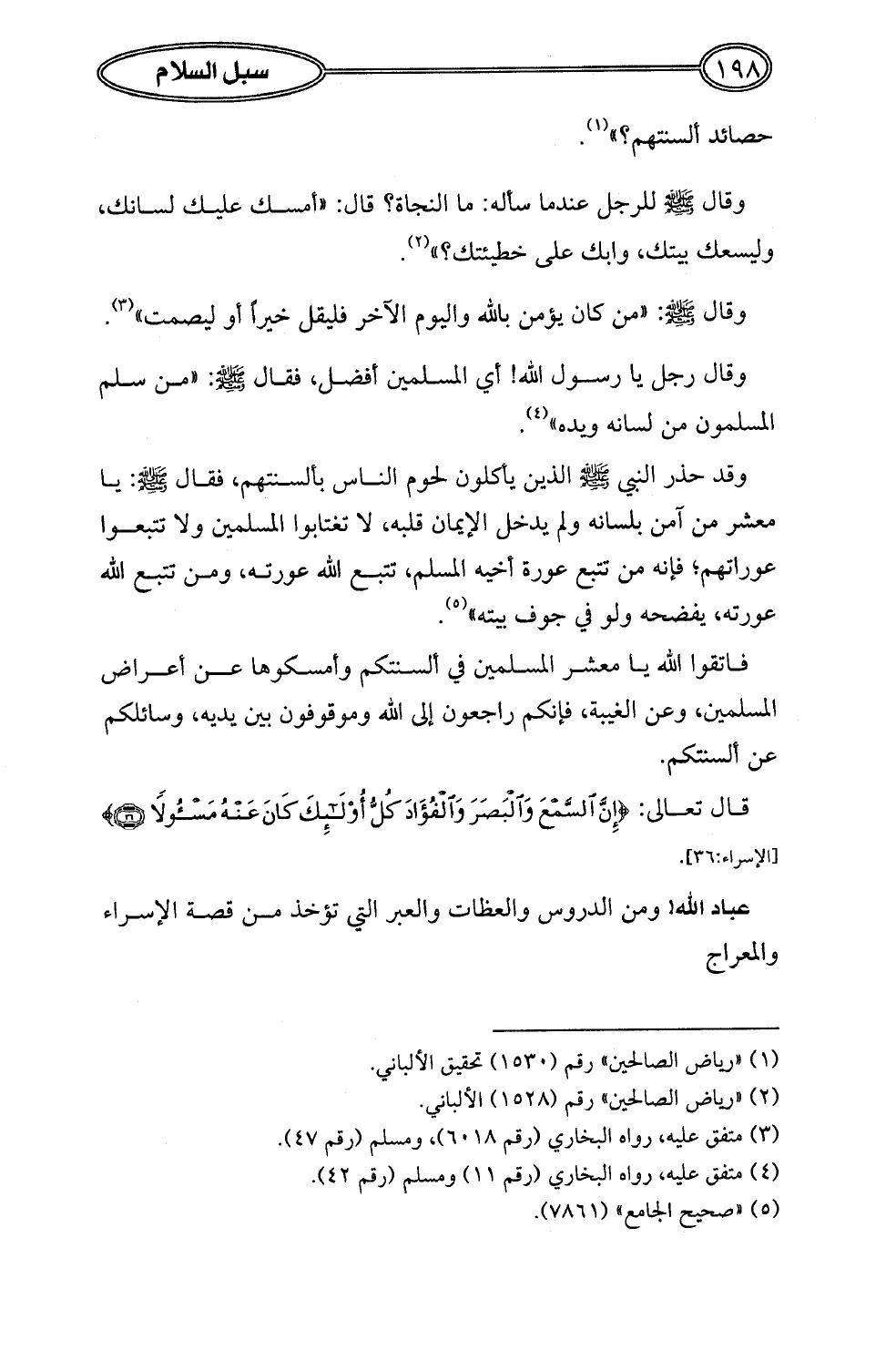 فاتقوا الله يا معشر المسلمين في ألسنتكم وأمسكوها عن أعراض المسلمين، وعن الغيبة، فإنكم راجعون إلى الله وموقوفون بين يديه، وسائلكم عن ألسنتكم.
