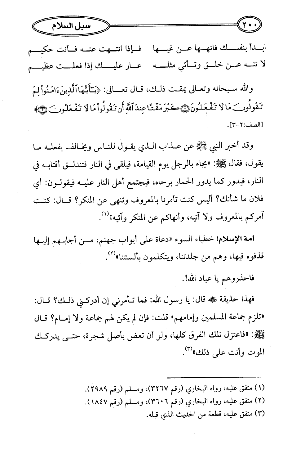 أمة الإِسلام! خطباء السوء "دعاة على أبواب جهنم، من أجابهم إليها قذفوه فيها، وهم من جلدتنا، ويتكلمون بألسنتنا" (¬2).