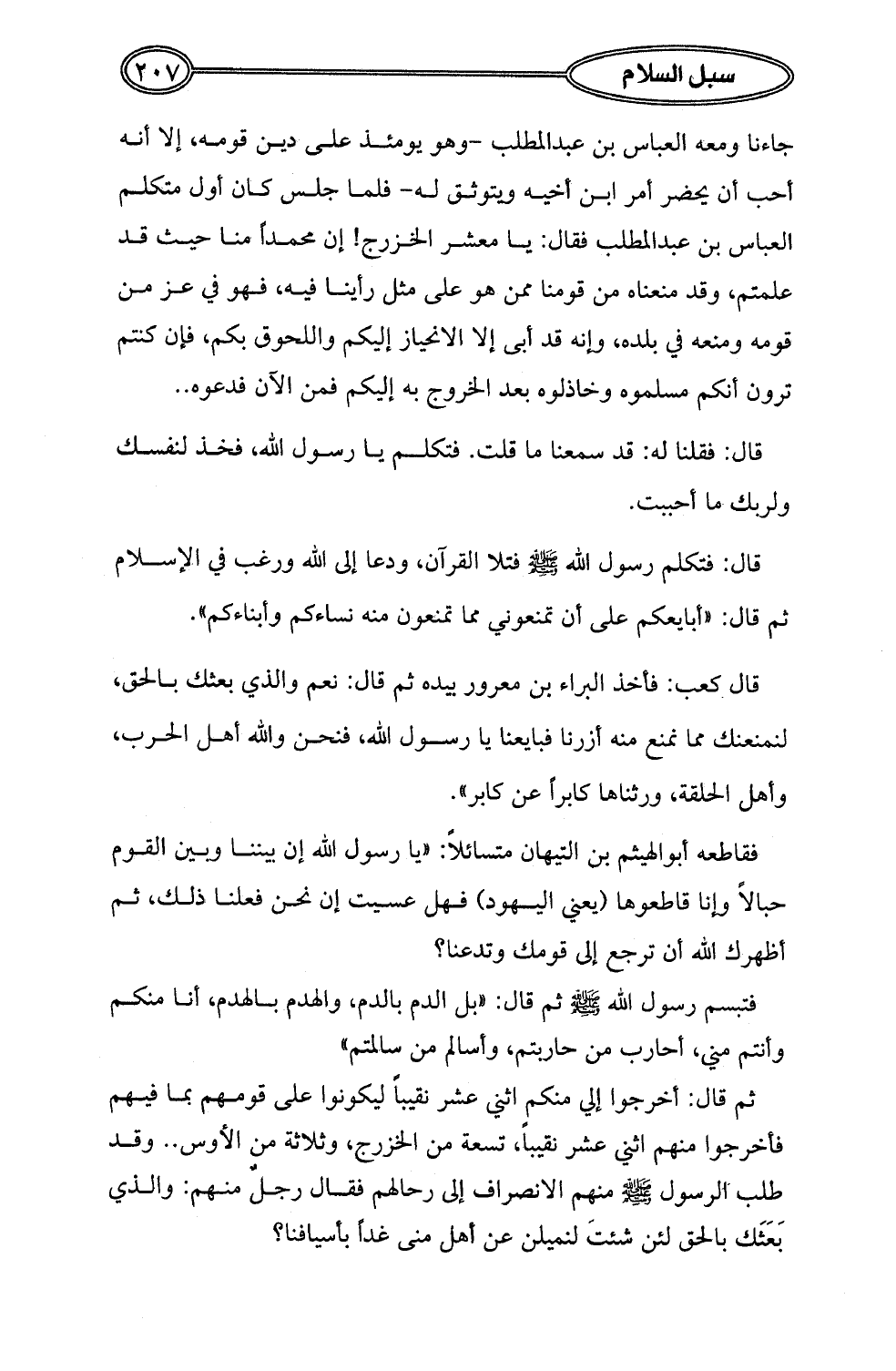 جاءنا ومعه العباس بن عبد المطلب -وهو يومئذ على دين قومه، إلا أنه أحب أن يحضر أمر ابن أخيه ويتوثق له- فلما جلس كان أول متكلم العباس بن عبد المطلب فقال: يا معشر الخزرج! إن محمداً منا حيث قد علمتم، وقد منعناه من قومنا ممن هو على مثل رأينا فيه، فهو في عز من قومه ومنعه في بلده، وإنه قد أبى إلا الانحياز إليكم واللحوق بكم، فإن كنتم ترون أنكم مسلموه وخاذلوه بعد الخروج به إليكم فمن الآن فدعوه ..