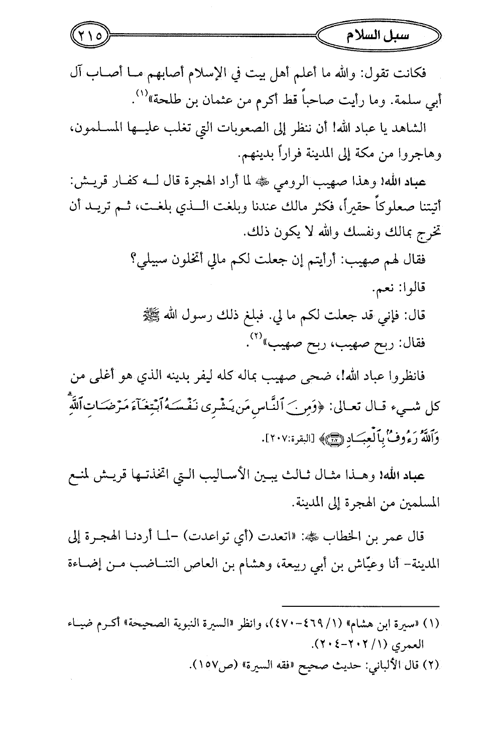 عباد الله! وهذا صهيب الرومي - رضي الله عنه - لما أراد الهجرة قال له كفار قريش: أتيتنا صعلوكاً حقيراً، فكثر مالك عندنا وبلغت الذي بلغت، ثم تريد أن تخرج بمالك ونفسك والله لا يكون ذلك.