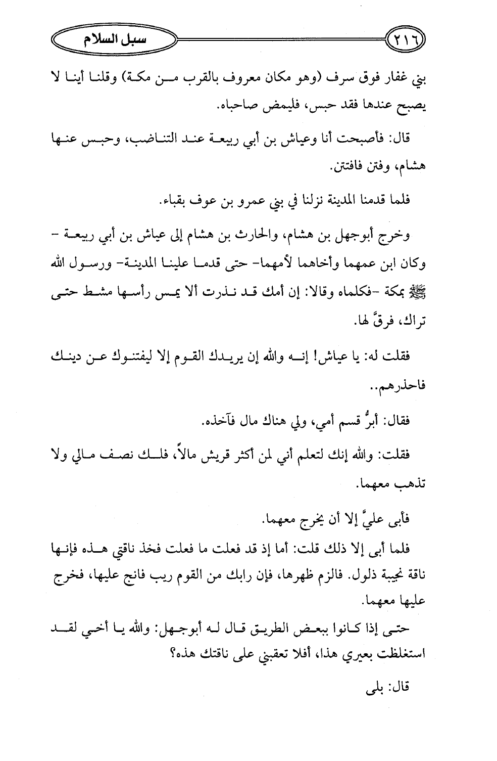 حتى إذا كانوا ببعض الطريق قال له أبو جهل: والله يا أخي لقد استغلظت بعيري هذا، أفلا تعقبني على ناقتك هذه؟