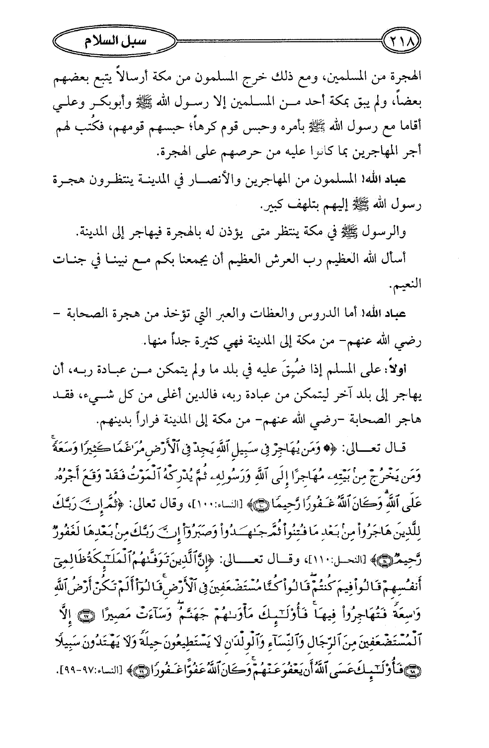 قال تعالى: {وَمَنْ يُهَاجِرْ فِي سَبِيلِ اللَّهِ يَجِدْ فِي الْأَرْضِ مُرَاغَمًا كَثِيرًا وَسَعَةً وَمَنْ يَخْرُجْ مِنْ بَيْتِهِ مُهَاجِرًا إِلَى اللَّهِ وَرَسُولِهِ ثُمَّ يُدْرِكْهُ الْمَوْتُ فَقَدْ وَقَعَ أَجْرُهُ عَلَى اللَّهِ وَكَانَ اللَّهُ غَفُورًا رَحِيمًا (100)} [النساء: 100]، وقال تعالى: {ثُمَّ إِنَّ رَبَّكَ لِلَّذِينَ هَاجَرُوا مِنْ بَعْدِ مَا فُتِنُوا ثُمَّ جَاهَدُوا وَصَبَرُوا إِنَّ رَبَّكَ مِنْ بَعْدِهَا لَغَفُورٌ رَحِيمٌ (110)} [النحل: 110]، وقال تعالى: {إِنَّ الَّذِينَ تَوَفَّاهُمُ الْمَلَائِكَةُ ظَالِمِي أَنْفُسِهِمْ قَالُوا فِيمَ كُنْتُمْ قَالُوا كُنَّا مُسْتَضْعَفِينَ فِي الْأَرْضِ قَالُوا أَلَمْ تَكُنْ أَرْضُ اللَّهِ وَاسِعَةً فَتُهَاجِرُوا فِيهَا فَأُولَئِكَ مَأْوَاهُمْ جَهَنَّمُ وَسَاءَتْ مَصِيرًا (97) إِلَّا الْمُسْتَضْعَفِينَ مِنَ الرِّجَالِ وَالنِّسَاءِ وَالْوِلْدَانِ لَا يَسْتَطِيعُونَ حِيلَةً وَلَا يَهْتَدُونَ سَبِيلًا (98) فَأُولَئِكَ عَسَى اللَّهُ أَنْ يَعْفُوَ عَنْهُمْ وَكَانَ اللَّهُ عَفُوًّا غَفُورًا (99)} [النساء: 97 - 99].