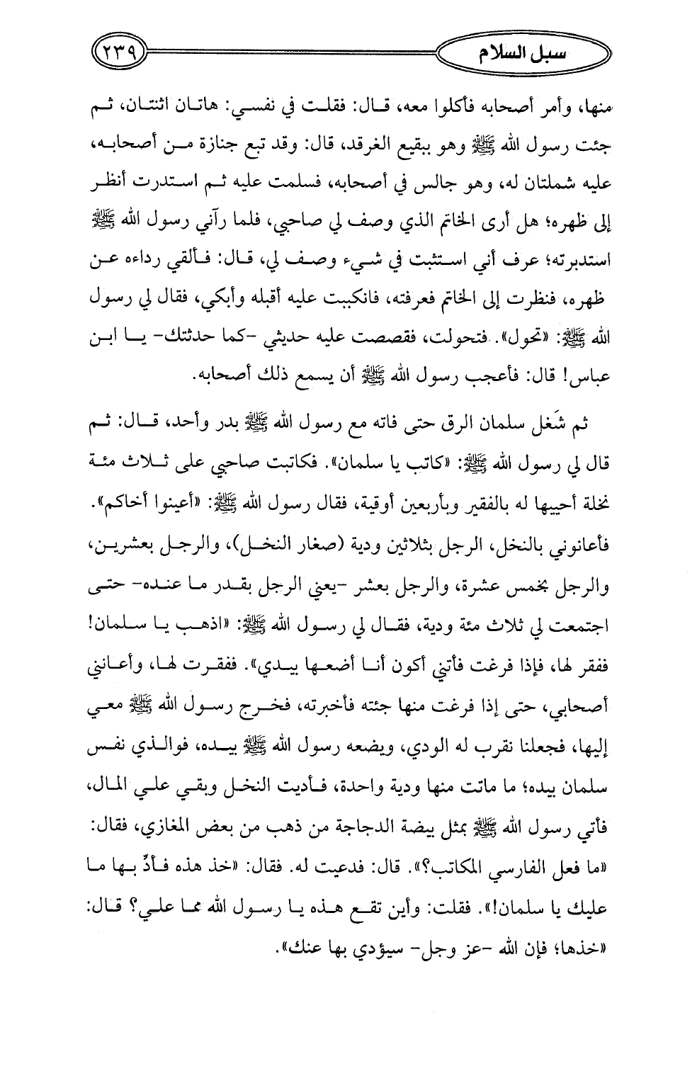منها، وأمر أصحابه فأكلوا معه، قال: فقلت في نفسي: هاتان اثنتان، ثم جئت رسول الله - صلى الله عليه وسلم - وهو ببقيع الغرقد، قال: وقد تبع جنازة من أصحابه، عليه شملتان له، وهو جالس في أصحابه، فسلمت عليه ثم استدرت أنظر إلى ظهره؛ هل أرى الخاتم الذي وصف لي صاحبي، فلما رآني رسول الله - صلى الله عليه وسلم - استدبرته؛ عرف أني استثبت في شيء وصف لي، قال: فألقي رداءه عن ظهره، فنظرت إلى الخاتم فعرفته، فانكببت عليه أقبله وأبكي، فقال لي رسول الله - صلى الله عليه وسلم -: "تحول". فتحولت، فقصصت عليه حديثي -كما حدثتك- يا ابن عباس! قال: فأعجب رسول الله - صلى الله عليه وسلم - أن يسمع ذلك أصحابه. ثم شَغل سلمان الرق حتى فاته مع رسول الله - صلى الله عليه وسلم - بدر واحد، قال: ثم قال لي رسول الله - صلى الله عليه وسلم -: "كاتب يا سلمان". فكاتبت صاحبي على ثلاث مئة نخلة أحييها له بالفقير وبأربعين أوقية، فقال رسول الله - صلى الله عليه وسلم -: "أعينوا أخاكم".
