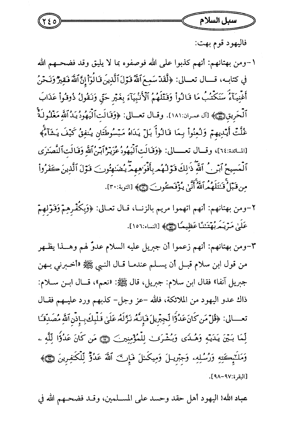 3 - ومن بهتانهم: أنهم زعموا أن جبريل عليه السلام عدوٌّ لهم وهذا يظهر من قول ابن سلام قبل أن يسلم عندما قال النبي - صلى الله عليه وسلم - "أخبرني بهن جبريل آنفا" فقال ابن سلام: جبريل، قال - صلى الله عليه وسلم -: "نعم"، قال ابن سلام: ذاك عدو اليهود من الملائكة، فالله -عز وجل- كذبهم ورد عليهم فقال تعالى: {قُلْ مَنْ كَانَ عَدُوًّا لِجِبْرِيلَ فَإِنَّهُ نَزَّلَهُ عَلَى قَلْبِكَ بِإِذْنِ اللَّهِ مُصَدِّقًا لِمَا بَيْنَ يَدَيْهِ وَهُدًى وَبُشْرَى لِلْمُؤْمِنِينَ (97) مَنْ كَانَ عَدُوًّا لِلَّهِ وَمَلَائِكَتِهِ وَرُسُلِهِ وَجِبْرِيلَ وَمِيكَالَ فَإِنَّ اللَّهَ عَدُوٌّ لِلْكَافِرِينَ (98)} [البقرة: 97 - 98].