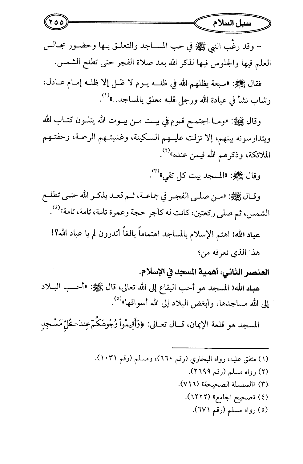 - وقد رغَّب النبي - صلى الله عليه وسلم - في حب المساجد والتعلق بها وحضور مجالس العلم فيها والجلوس فيها لذكر الله بعد صلاة الفجر حتى تطلع الشمس.