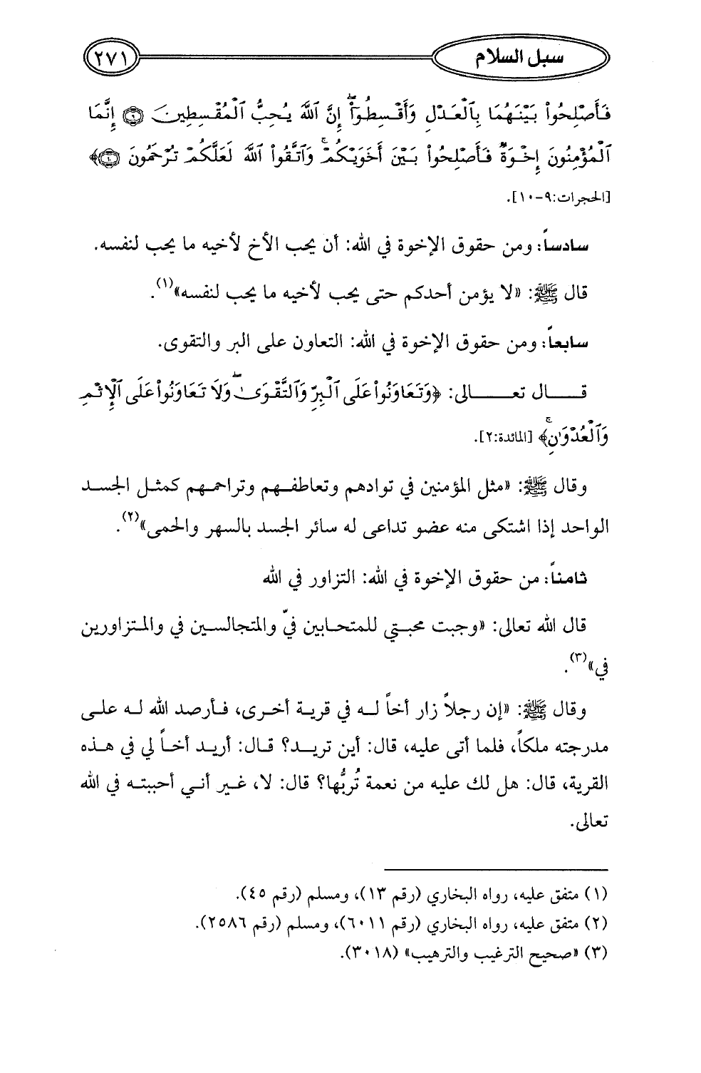 وقال - صلى الله عليه وسلم -: "إن رجلاً زار أخاً له في قرية أخرى، فأرصد الله له على مدرجته ملكاً، فلما أتى عليه، قال: أين تريد؟ قال: أريد أخاً لي في هذه القرية، قال: هل لك عليه من نعمة تُربُّها؟ قال: لا، غير أني أحببته في الله تعالى.