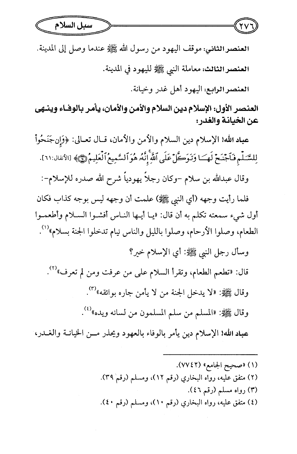 العنصر الأول: الإِسلام دين السلام والأمن والأمان، يأمر بالوفاء وينهى عن الخيانة والغدر: