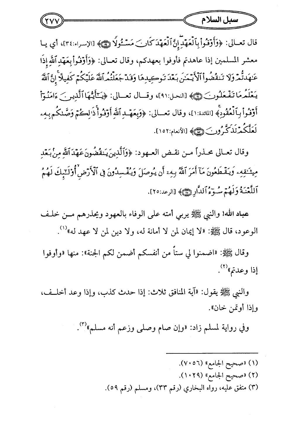 قال تعالى: {وَأَوْفُوا بِالْعَهْدِ إِنَّ الْعَهْدَ كَانَ مَسْئُولًا (34)} [الإسراء:34]، أي يا معشر المسلمين إذا عاهدتم فأوفوا بعهدكم، وقال تعالى: {وَأَوْفُوا بِعَهْدِ اللَّهِ إِذَا عَاهَدْتُمْ وَلَا تَنْقُضُوا الْأَيْمَانَ بَعْدَ تَوْكِيدِهَا وَقَدْ جَعَلْتُمُ اللَّهَ عَلَيْكُمْ كَفِيلًا إِنَّ اللَّهَ يَعْلَمُ مَا تَفْعَلُونَ (91)} [النحل: 91]، وقال تعالى: {يَا أَيُّهَا الَّذِينَ آمَنُوا أَوْفُوا بِالْعُقُودِ} [المائدة: 1]، وقال تعالى: {وَبِعَهْدِ اللَّهِ أَوْفُوا ذَلِكُمْ وَصَّاكُمْ بِهِ لَعَلَّكُمْ تَذَكَّرُونَ (152)} [الأنعام: 152].