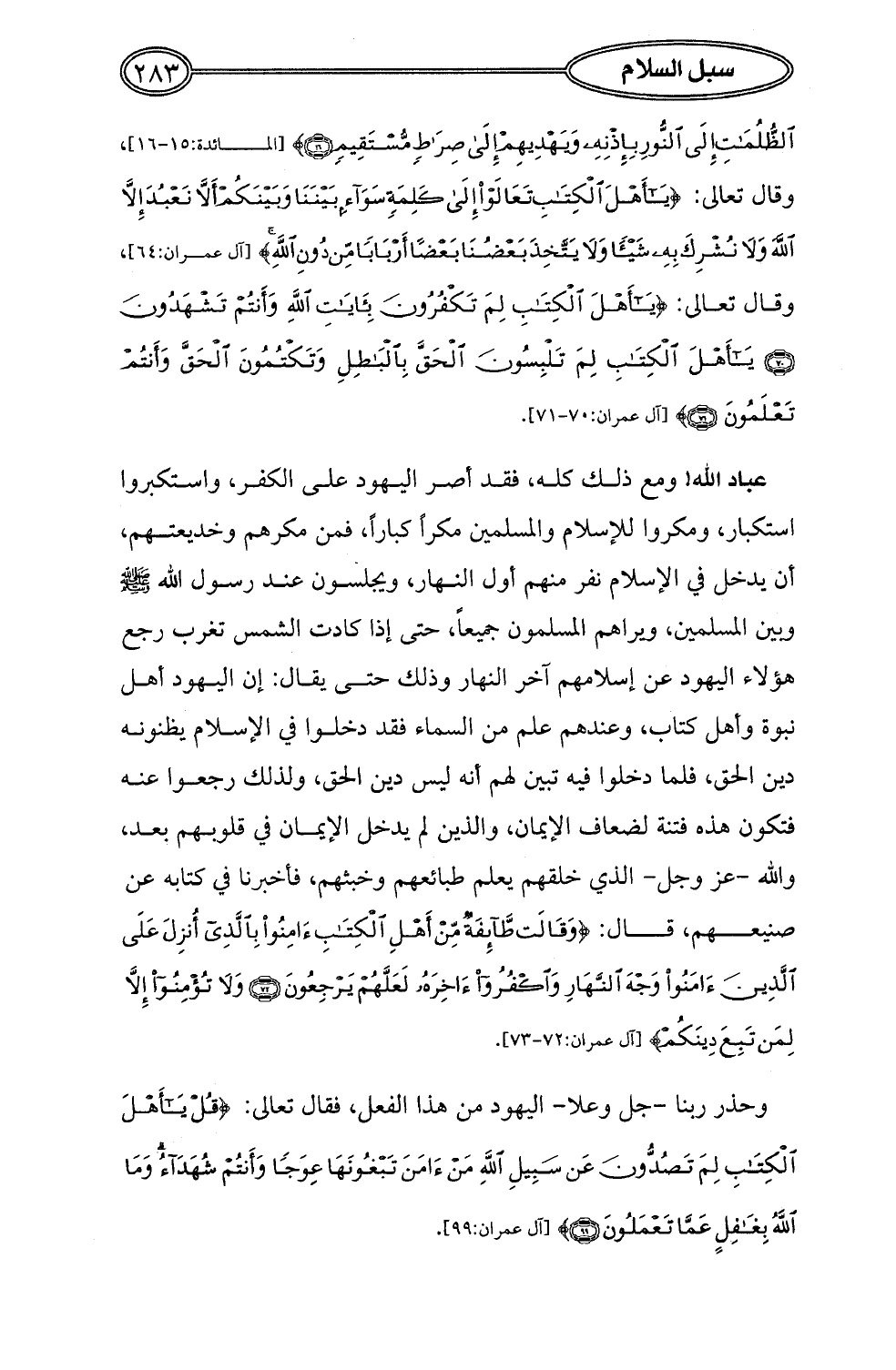 وحذر ربنا -جل وعلا- اليهود من هذا الفعل، فقال تعالى: {قُلْ يَا أَهْلَ الْكِتَابِ لِمَ تَصُدُّونَ عَنْ سَبِيلِ اللَّهِ مَنْ آمَنَ تَبْغُونَهَا عِوَجًا وَأَنْتُمْ شُهَدَاءُ وَمَا اللَّهُ بِغَافِلٍ عَمَّا تَعْمَلُونَ (99)} [آل عمران: 99].