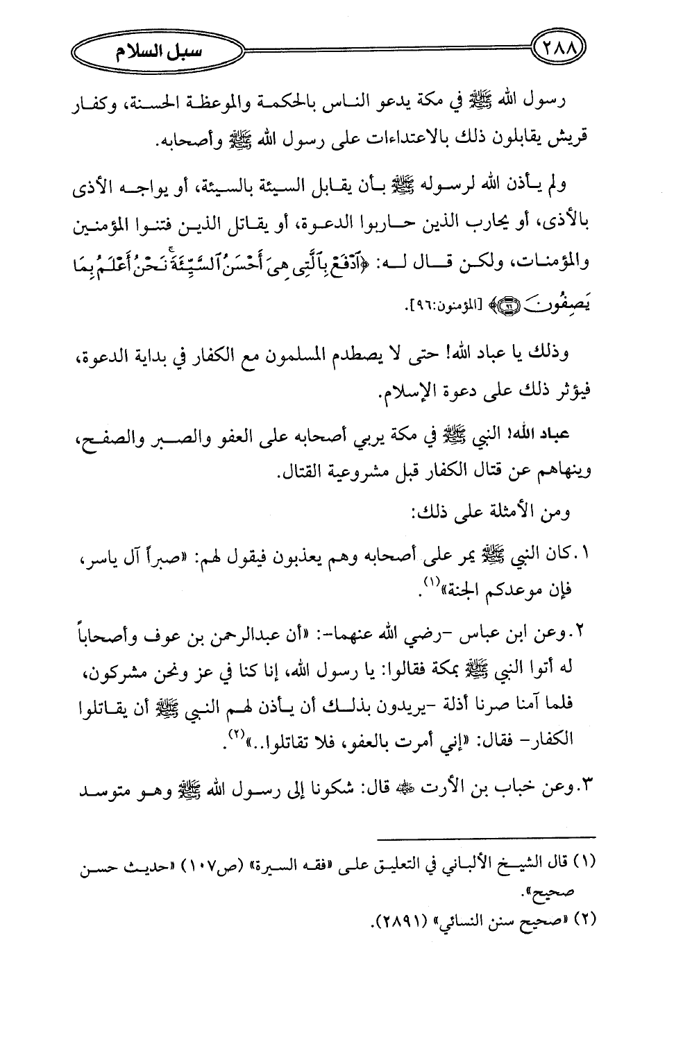 2. وعن ابن عباس -رضي الله عنهما-: "أن عبد الرحمن بن عوف وأصحاباً له أتوا النبي - صلى الله عليه وسلم - بمكة فقالوا: يا رسول الله، إنا كنا في عز ونحن مشركون، فلما آمنا صرنا أذلة- يريدون بذلك أن يأذن لهم النبي - صلى الله عليه وسلم - أن يقاتلوا الكفار- فقال: "إني أمرت بالعفو، فلا تقاتلوا .. " (¬2).