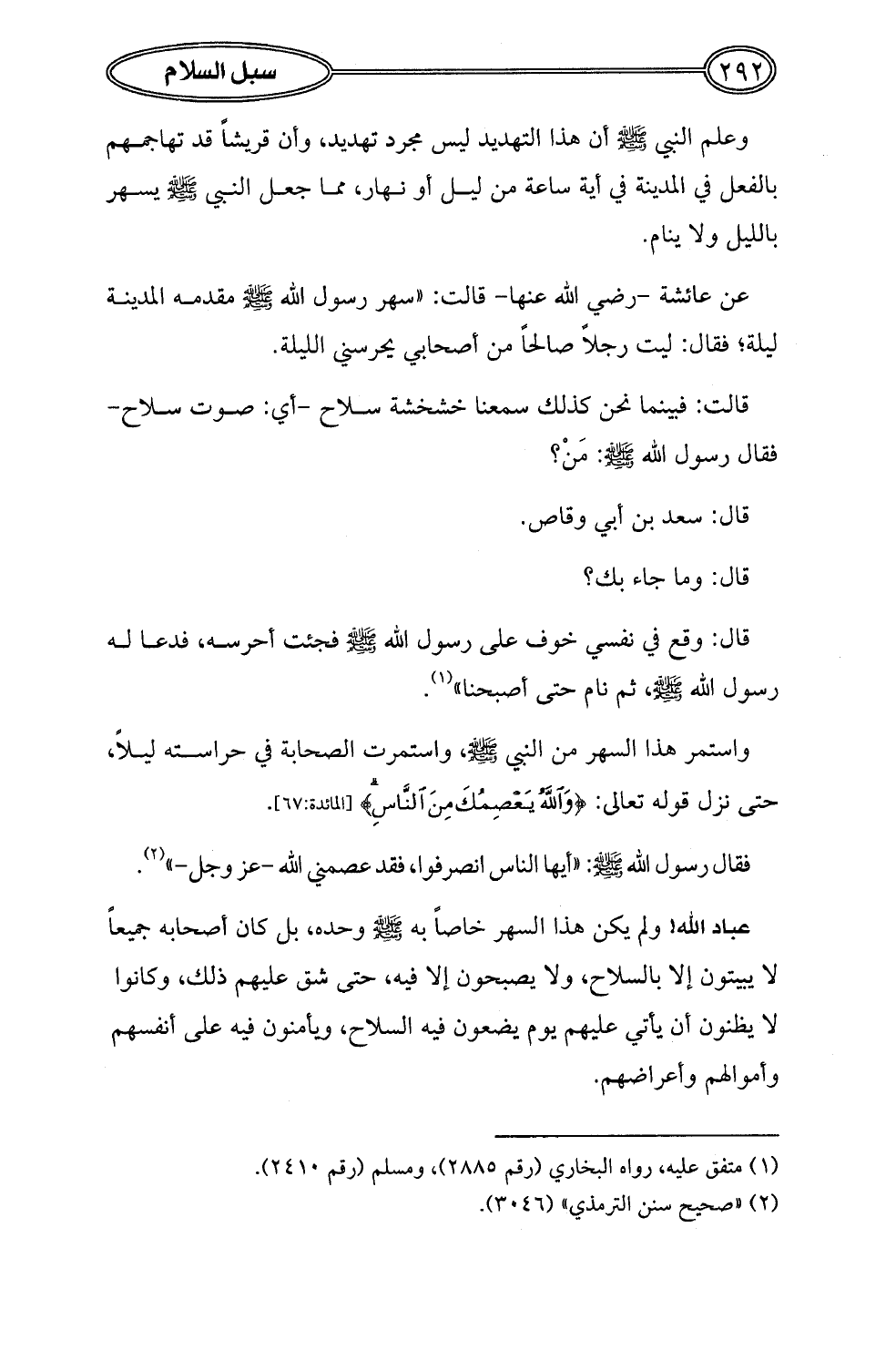 عن عائشة -رضي الله عنها- قالت: "سهر رسول الله - صلى الله عليه وسلم - مقدمه المدينة ليلة؟ فقال: ليت رجلاً صالحاً من أصحابي يحرسني الليلة.