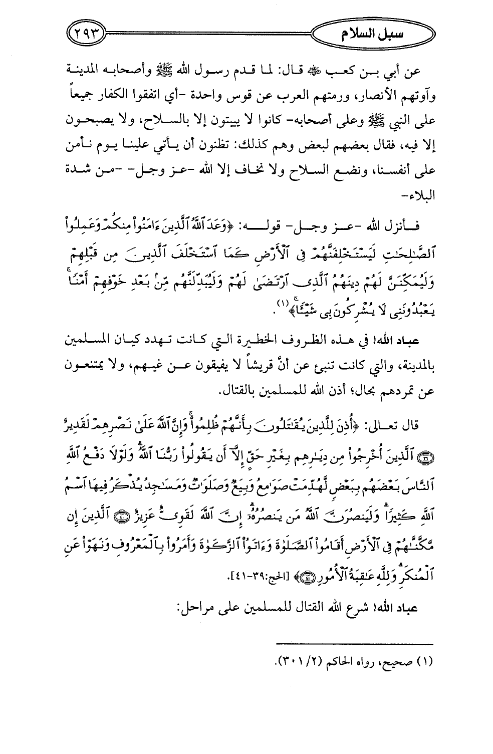 قال تعالى: {أُذِنَ لِلَّذِينَ يُقَاتَلُونَ بِأَنَّهُمْ ظُلِمُوا وَإِنَّ اللَّهَ عَلَى نَصْرِهِمْ لَقَدِيرٌ (39) الَّذِينَ أُخْرِجُوا مِنْ دِيَارِهِمْ بِغَيْرِ حَقٍّ إِلَّا أَنْ يَقُولُوا رَبُّنَا اللَّهُ وَلَوْلَا دَفْعُ اللَّهِ النَّاسَ بَعْضَهُمْ بِبَعْضٍ لَهُدِّمَتْ صَوَامِعُ وَبِيَعٌ وَصَلَوَاتٌ وَمَسَاجِدُ يُذْكَرُ فِيهَا اسْمُ اللَّهِ كَثِيرًا وَلَيَنْصُرَنَّ اللَّهُ مَنْ يَنْصُرُهُ إِنَّ اللَّهَ لَقَوِيٌّ عَزِيزٌ (40) الَّذِينَ إِنْ مَكَّنَّاهُمْ فِي الْأَرْضِ أَقَامُوا الصَّلَاةَ وَآتَوُا الزَّكَاةَ وَأَمَرُوا بِالْمَعْرُوفِ وَنَهَوْا عَنِ الْمُنْكَرِ وَلِلَّهِ عَاقِبَةُ الْأُمُورِ (41)} [الحج: 39 - 41].