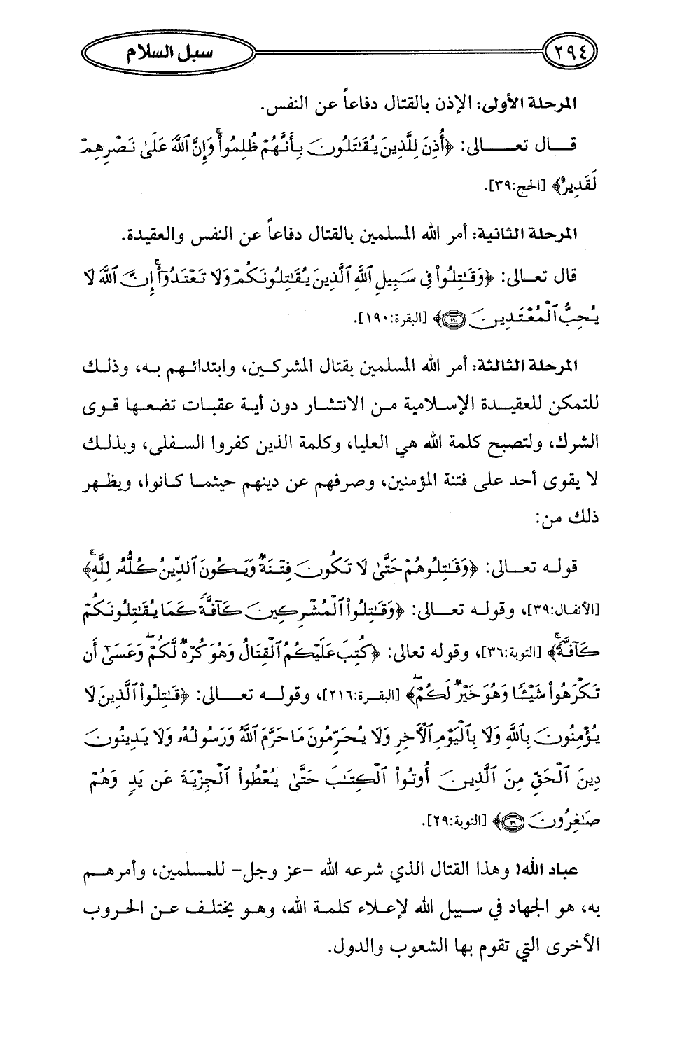 قوله تعالى: {وَقَاتِلُوهُمْ حَتَّى لَا تَكُونَ فِتْنَةٌ وَيَكُونَ الدِّينُ كُلُّهُ لِلَّهِ} [الأنفال: 39]، وقوله تعالى: {وَقَاتِلُوا الْمُشْرِكِينَ كَافَّةً كَمَا يُقَاتِلُونَكُمْ كَافَّةً} [التوبة: 36]، وقوله تعالى: {كُتِبَ عَلَيْكُمُ الْقِتَالُ وَهُوَ كُرْهٌ لَكُمْ وَعَسَى أَنْ تَكْرَهُوا شَيْئًا وَهُوَ خَيْرٌ لَكُمْ} [البقرة: 216]، وقوله تعالى: {قَاتِلُوا الَّذِينَ لَا يُؤْمِنُونَ بِاللَّهِ وَلَا بِالْيَوْمِ الْآخِرِ وَلَا يُحَرِّمُونَ مَا حَرَّمَ اللَّهُ وَرَسُولُهُ وَلَا يَدِينُونَ دِينَ الْحَقِّ مِنَ الَّذِينَ أُوتُوا الْكِتَابَ حَتَّى يُعْطُوا الْجِزْيَةَ عَنْ يَدٍ وَهُمْ صَاغِرُونَ (29)} [التوبة: 29].