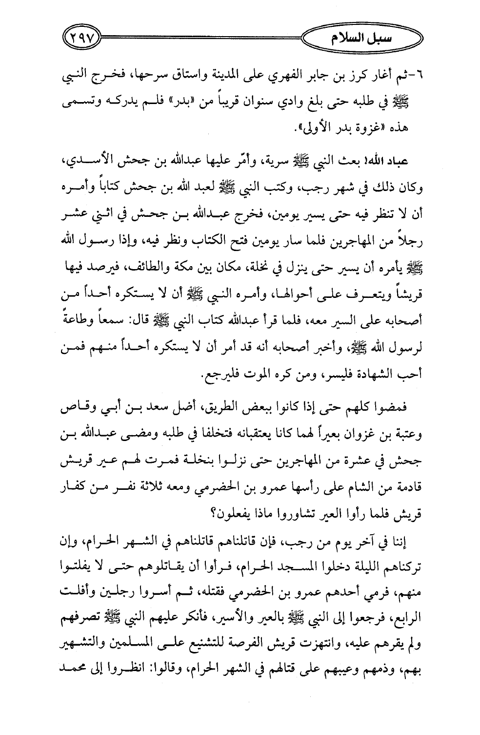 6 - ثم أغار كرز بن جابر الفهري على المدينة واستاق سرحها، فخرج النبي - صلى الله عليه وسلم - في طلبه حتى بلغ وادي سنوان قريباً من "بدر" فلم يدركه وتسمى هذه "غزوة بدر الأولى".