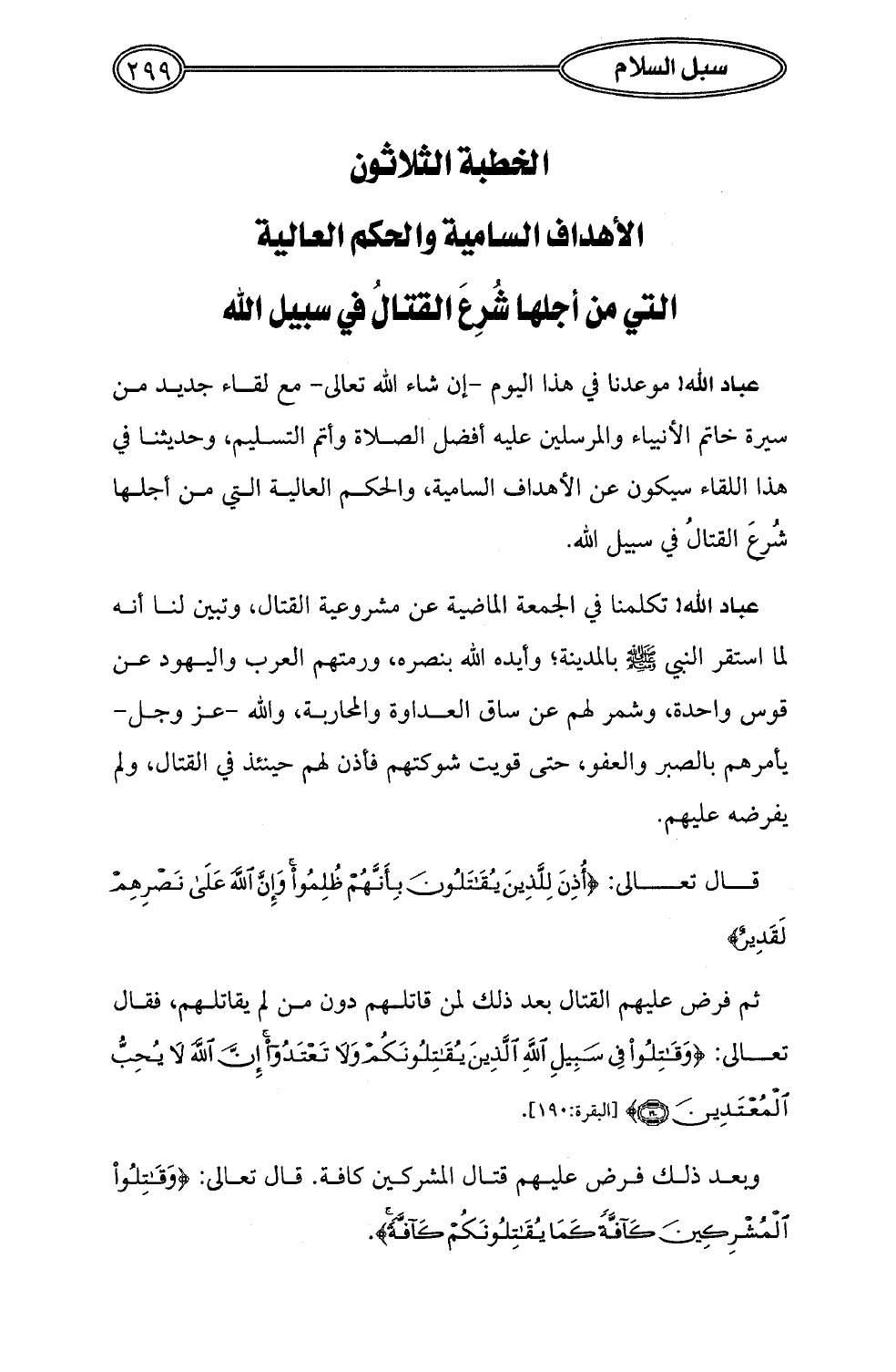 عباد الله! موعدنا في هذا اليوم -إن شاء الله تعالى- مع لقاء جديد من سيرة خاتم الأنبياء والمرسلين عليه أفضل الصلاة وأتم التسليم، وحديثنا في هذا اللقاء سيكون عن الأهداف السامية، والحكم العالية التي من أجلها شُرعَ القتالُ في سبيل الله.