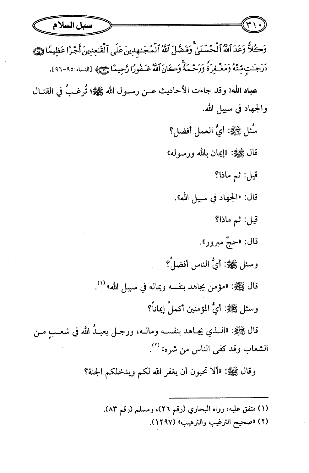 قال - صلى الله عليه وسلم -: "مؤمن يجاهد بنفسه وبماله في سبيل الله" (¬1).