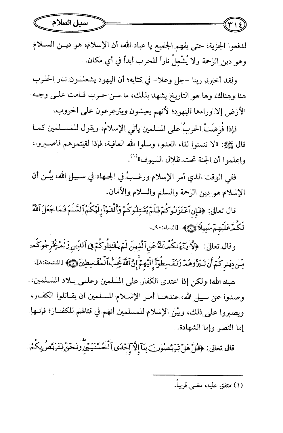 فإذا فُرضِتْ الحربُ على المسلمين يأتي الإِسلامُ، ويقول للمسلمين كما قال - صلى الله عليه وسلم -: "لا تتمنوا لقاء العدو، وسلوا الله العافية، فإذا لقيتموهم فاصبروا، واعلموا أن الجنة تحت ظلال السيوف" (¬1).