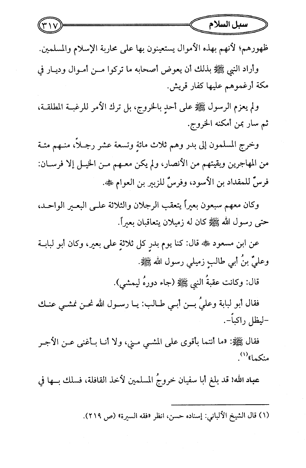 عن ابن مسعود - رضي الله عنه - قال: كنا يوم بدرٍ كل ثلاثةٍ على بعير، وكان أبو لبابة وعليٌ بن أبي طالبٍ زميلي رسول الله- صلى الله عليه وسلم -.