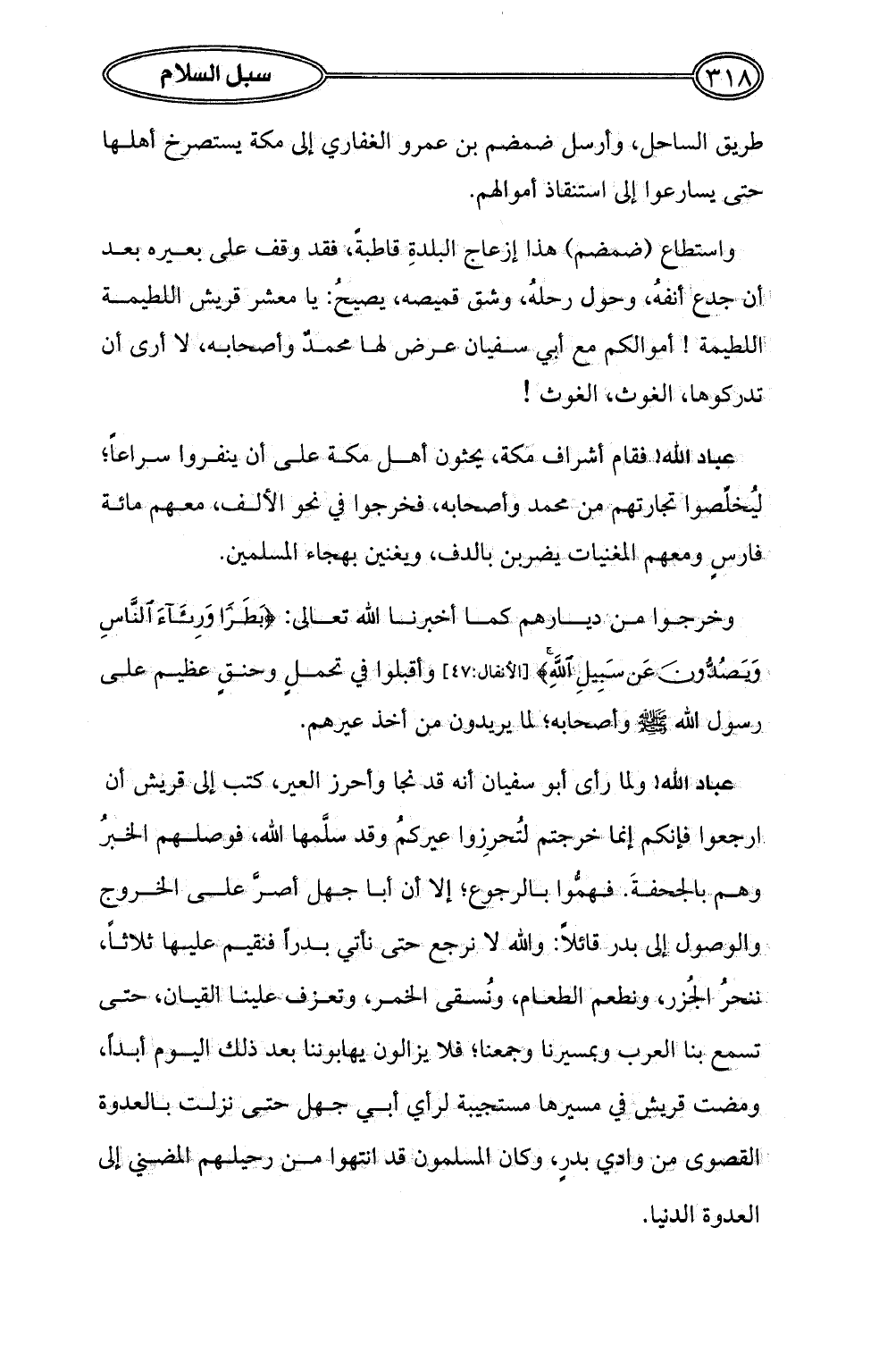 طريق الساحل، وأرسل ضمضم بن عمرو الغفاري إلى مكة يستصرخ أهلها حتى يسارعوا إلى استنقاذ أموالهم.