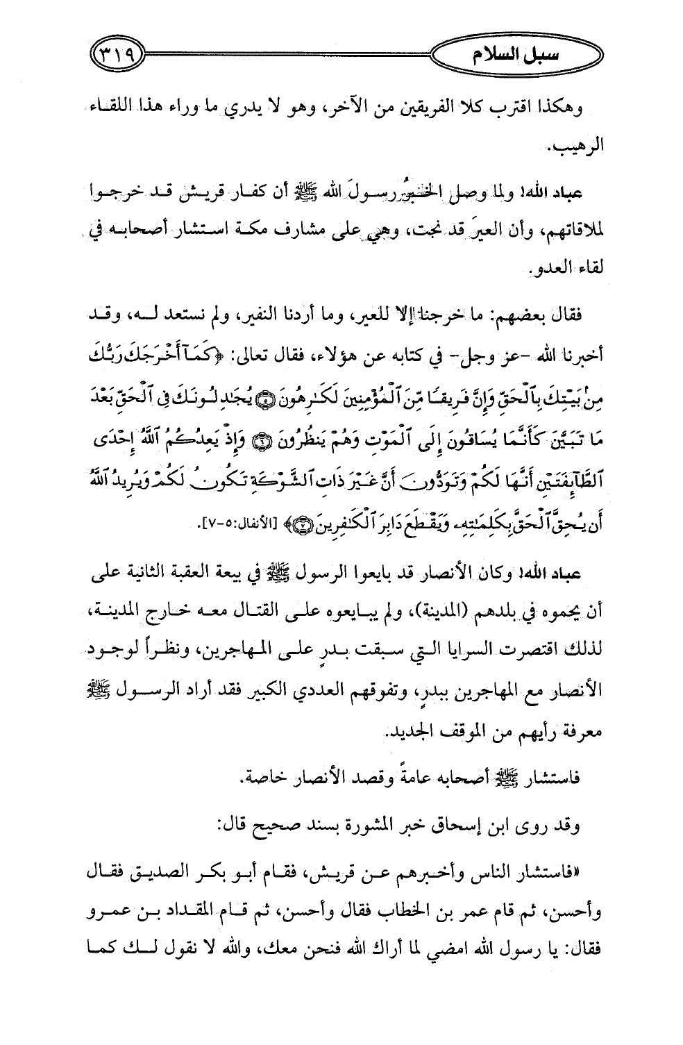 "فاستشار الناس وأخبرهم عن قريش، فقام أبو بكر الصديق فقال وأحسن، ثم قام عمر بن الخطاب فقال وأحسن، ثم قام المقداد بن عمرو فقال: يا رسول الله امضي لما أراك الله فنحن معك، والله لا نقول لك كما