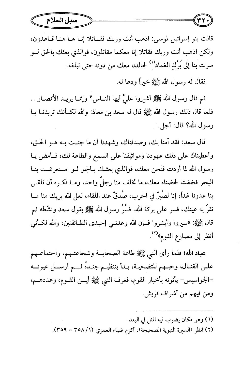قال سعد: فقد آمنا بك، وصدقناك، وشهدنا أن ما جئت به هو الحق، وأعطيناك على ذلك عهودنا ومواثيقنا على السمع والطاعة لك، فامض يا رسول الله لما أردت فنحن معك، فوالذي بعثك بالحق لو استعرضت بنا البحر فخضته لخضناه معك، ما تخلف منا رجلٌ واحد، وما نكره أن تلقى بنا عدونا غداً، إنا لصُبرٌ في الحرب، صُدقٌ عند اللقاء، لعل الله يريك منا ما تقرُ به عينك، فسر على بركة الله. فسُر رسول الله- صلى الله عليه وسلم - بقول سعد ونشّطه ثم قال - صلى الله عليه وسلم -: "سيروا وأبشروا فإن الله وعدني إحدى الطائفتين، والله لكأني أنظر إلى مصارع القوم" (¬2).
