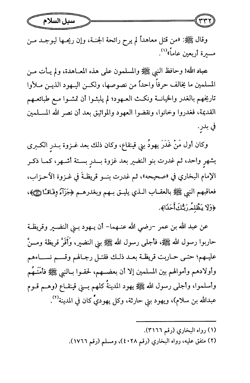 عن عبد الله بن عمر -رضي الله عنهما- أن يهود بني النضير وقريظة حاربوا رسول الله- صلى الله عليه وسلم -، فأجلى رسول الله - صلى الله عليه وسلم - بني النضير، وَأَقَرَّ قريظة ومنَّ عليهم؛ حتى حاربت قريظة بعد ذلك فقتل رجالهم وقسم نساءهم وأولادهم وأموالهم بين المسلمين إلا أن بعضهم، لحقوا بالنبي- صلى الله عليه وسلم - فأمَنَهُم وأسلموا، وأجلى رسول الله - صلى الله عليه وسلم - يهود المدينةُ كلهم بني قينقاع (وهم قوم عبد الله بن سلام)، ويهود بني حارثة، وكل يهوديٍّ كان في المدينة (¬2).