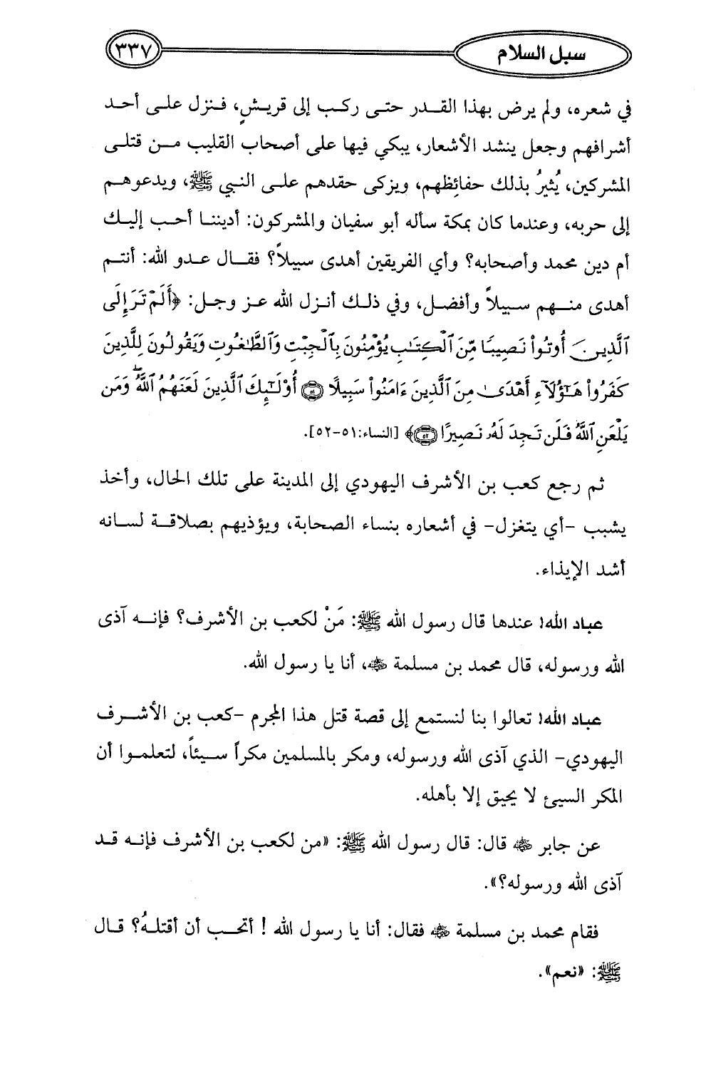 ثم رجع كعب بن الأشرف اليهودي إلى المدينة على تلك الحال، وأخذ يشبب -أي يتغزل- في أشعاره بنساء الصحابة، ويؤذيهم بصلاقة لسانه أشد الإيذاء.