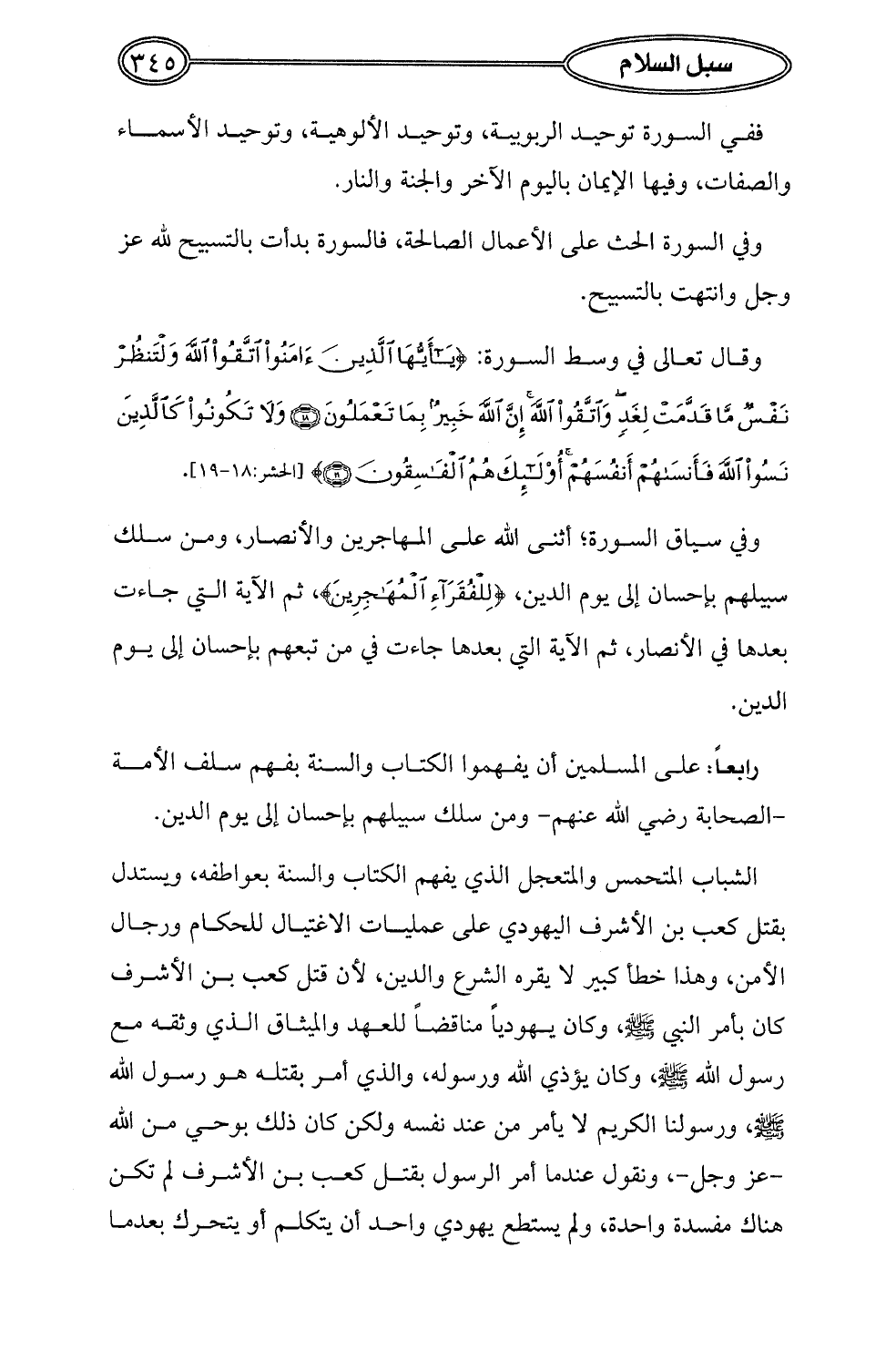 وقال تعالى في وسط السورة: {يَا أَيُّهَا الَّذِينَ آمَنُوا اتَّقُوا اللَّهَ وَلْتَنْظُرْ نَفْسٌ مَا قَدَّمَتْ لِغَدٍ وَاتَّقُوا اللَّهَ إِنَّ اللَّهَ خَبِيرٌ بِمَا تَعْمَلُونَ (18) وَلَا تَكُونُوا كَالَّذِينَ نَسُوا اللَّهَ فَأَنْسَاهُمْ أَنْفُسَهُمْ أُولَئِكَ هُمُ الْفَاسِقُونَ (19)} [الحشر: 18 - 19].