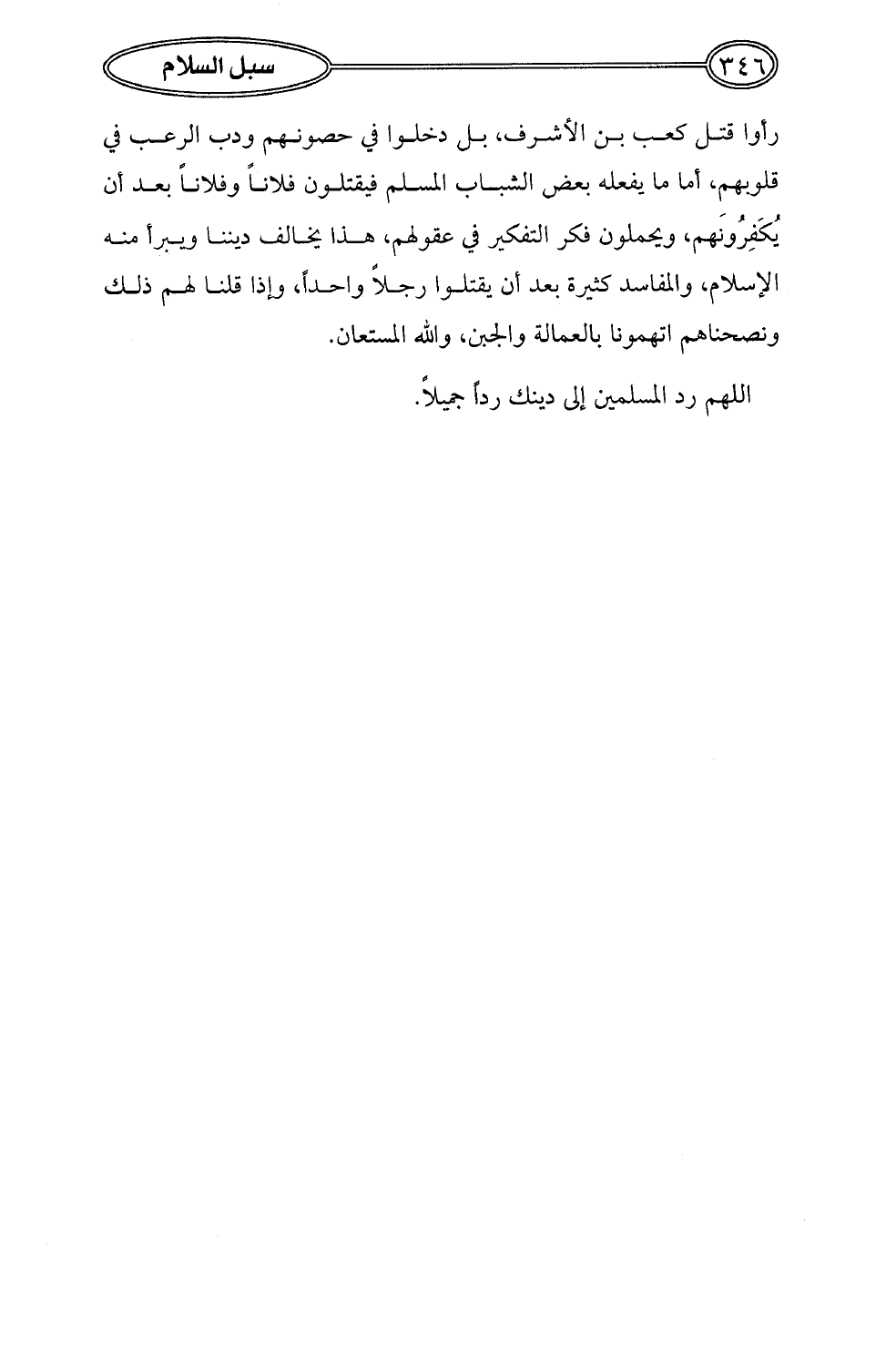 رأوا قتل كعب بن الأشرف، بل دخلوا في حصونهم ودب الرعب في قلوبهمِ، أما ما يفعله بعض الشباب المسلم فيقتلون فلاناً وفلاناً بعد أن يُكَفِّرُونهم، ويحملون فكر التكفير في عقولهم، هذا يخالف ديننا ويبرأ منه الإِسلام، والمفاسد كثيرة بعد أن يقتلوا رجلاً واحداًَ، وإذا قلنا لهم ذلك ونصحناهم اتهمونا بالعمالة والجبن، والله المستعان.
