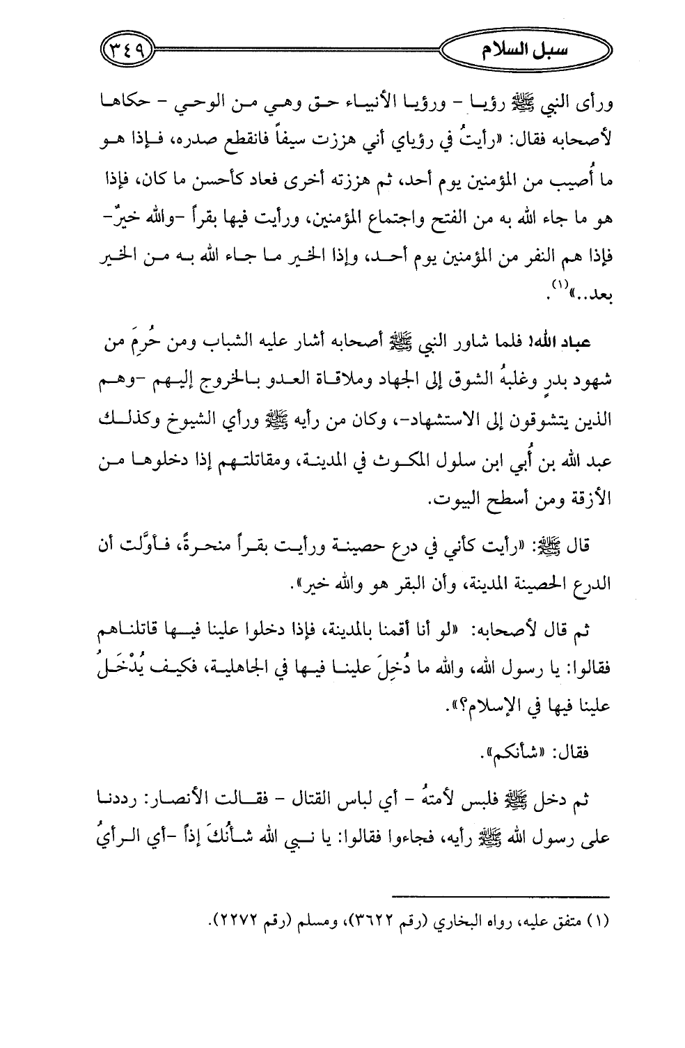 قال - صلى الله عليه وسلم -: "رأيت كأني في درع حصينة ورأيت بقراً منحرةً، فأوَّلت أن الدرع الحصينة المدينة، وأن البقر هو والله خير".